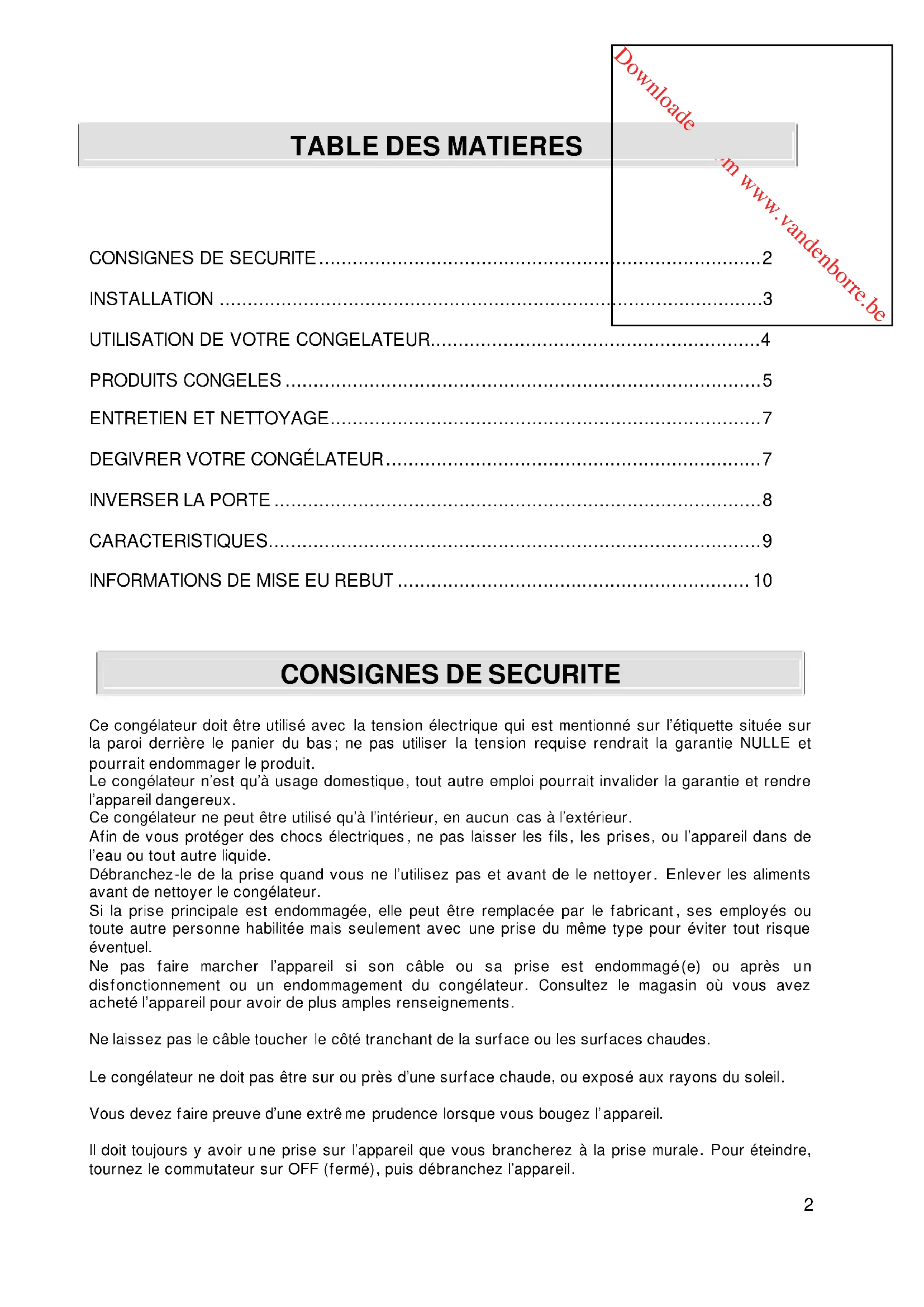 Ce congélateur doit être utilisé avec la tension électrique qui est mentionné sur l’étiquette située sur la paroi derrière le panier du bas; ne pas utiliser la tension requise rendrait la garantie NULLE et pourrait endommager le produit. Le congélateur n’est qu’à usage domestique, tout autre emploi pourrait invalider la garantie et rendre l’appareil dangereux. Ce congélateur ne peut être utilisé qu’à l’intérieur, en aucun cas à l’extérieur. Afin de vous protéger des chocs électriques, ne pas laisser les fils, les prises, ou l’appareil dans de l’eau ou tout autre liquide. Débranchez-le de la prise quand vous ne l’utilisez pas et avant de le nettoyer. Enlever les aliments avant de nettoyer le congélateur. Si la prise principale est endommagée, elle peut être remplacée par le fabricant, ses employés ou toute autre personne habilitée mais seulement avec une prise du même type pour éviter tout risque éventuel. Ne pas faire marcher l’appareil si son câble ou sa prise est endommagé(e) ou après un disfonctionnement ou un endommagement du congélateur. Consultez le magasin où vous avez acheté l’appareil pour avoir de plus amples renseignements. Ne laissez pas le câble toucher le côté tranchant de la surface ou les surfaces chaudes. Le congélateur ne doit pas être sur ou près d’une surface chaude, ou exposé aux rayons du soleil. Vous devez faire preuve d’une extrê me prudence lorsque vous bougez l’appareil. Il doit toujours y avoir une prise sur l’appareil que vous brancherez à la prise murale. Pour éteindre, tournez le commutateur sur OFF (fermé), puis débranchez l’appareil.Downloaded from www.vandenborre.be