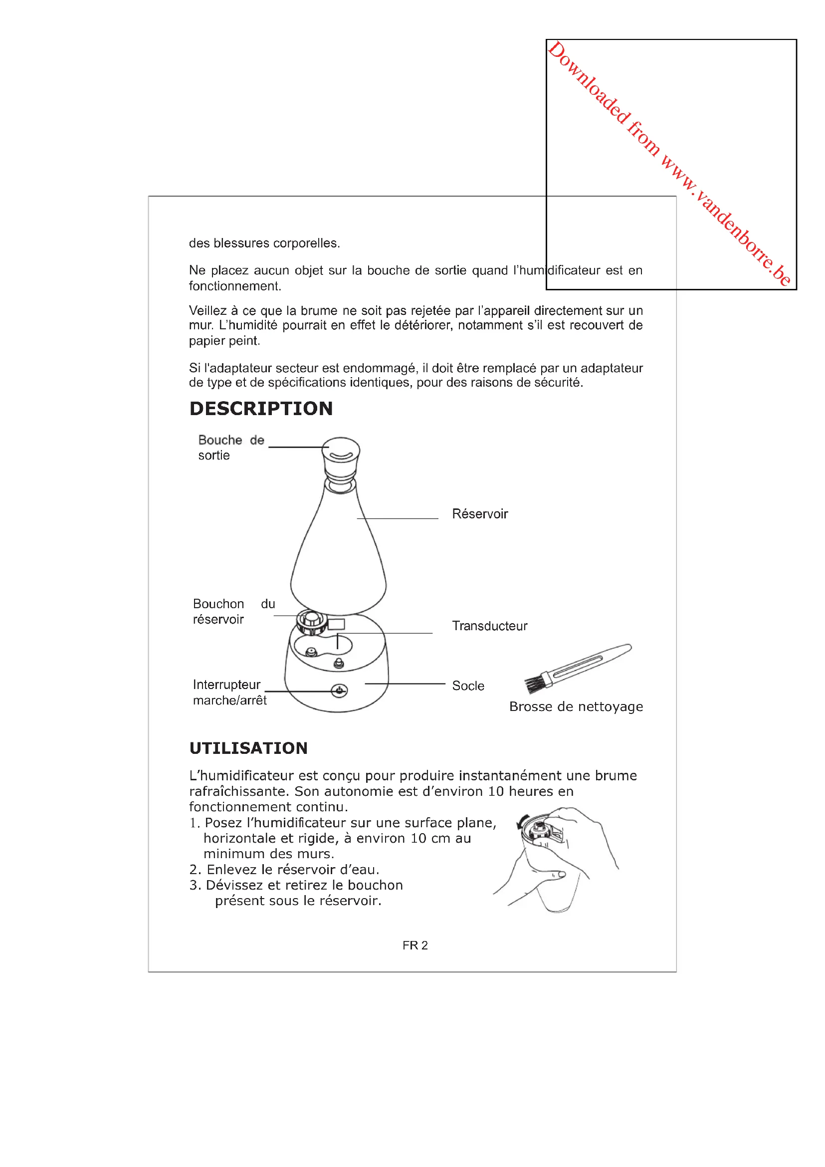 présent sous le réservoir. TraQVGXFWeXU sortie Réservoir %RXFKRQ Gu réservoir SoFOH ,QWHUUuSWHXU marFKH/arrêtDownloaded from www.vandenborre.be FR3