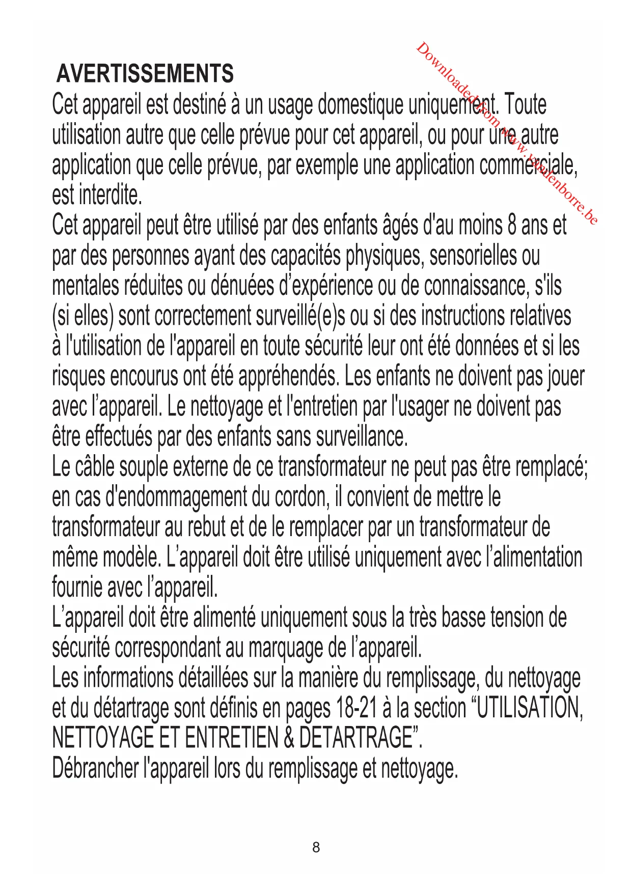 As a responsible retailer we care about the environment. As such we urge you to follow the correct disposal procedure for the appliance and packaging materials. This will help conserve natural resources and ensure that it is recycled in a manner that protects health and the environment. You must dispose of this appliance and its packaging according to local laws and regulations. Because this appliance contains electronic components, the appliance and its accessories must be disposed of separately from household waste when the appliance reaches its end of life. Contact your local authority to learn about disposal and recycling. The appliance should be taken to your local collection point for recycling. Some collection points accept appliance free of charge. DISPOSAL Downloaded from www.vandenborre.be8 AVERTISSEMENTS Cet appareil est destiné à un usage domestique uniquement. Toute utilisation autre que celle prévue pour cet appareil, ou pour une autre application que celle prévue, par exemple une application commerciale, est interdite. Cet appareil peut être utilisé par des enfants âgés d'au moins 8 ans et par des personnes ayant des capacités physiques, sensorielles ou mentales réduites ou dénuées d’expérience ou de connaissance, s'ils (si elles) sont correctement surveillé(e)s ou si des instructions relatives à l'utilisation de l'appareil en toute sécurité leur ont été données et si les risques encourus ont été appréhendés. Les enfants ne doivent pas jouer avec l’appareil. Le nettoyage et l'entretien par l'usager ne doivent pas être effectués par des enfants sans surveillance. Le câble souple externe de ce transformateur ne peut pas être remplacé; en cas d'endommagement du cordon, il convient de mettre le transformateur au rebut et de le remplacer par un transformateur de même modèle. L’appareil doit être utilisé uniquement avec l’alimentation fournie avec l’appareil. L’appareil doit être alimenté uniquement sous la très basse tension de sécurité correspondant au marquage de l’appareil. Les informations détaillées sur la manière du remplissage, du nettoyage et du détartrage sont définis en pages 18-21 à la section “UTILISATION, NETTOYAGE ET ENTRETIEN & DETARTRAGE”. Débrancher l'appareil lors du remplissage et nettoyage. Downloaded from www.vandenborre.be9