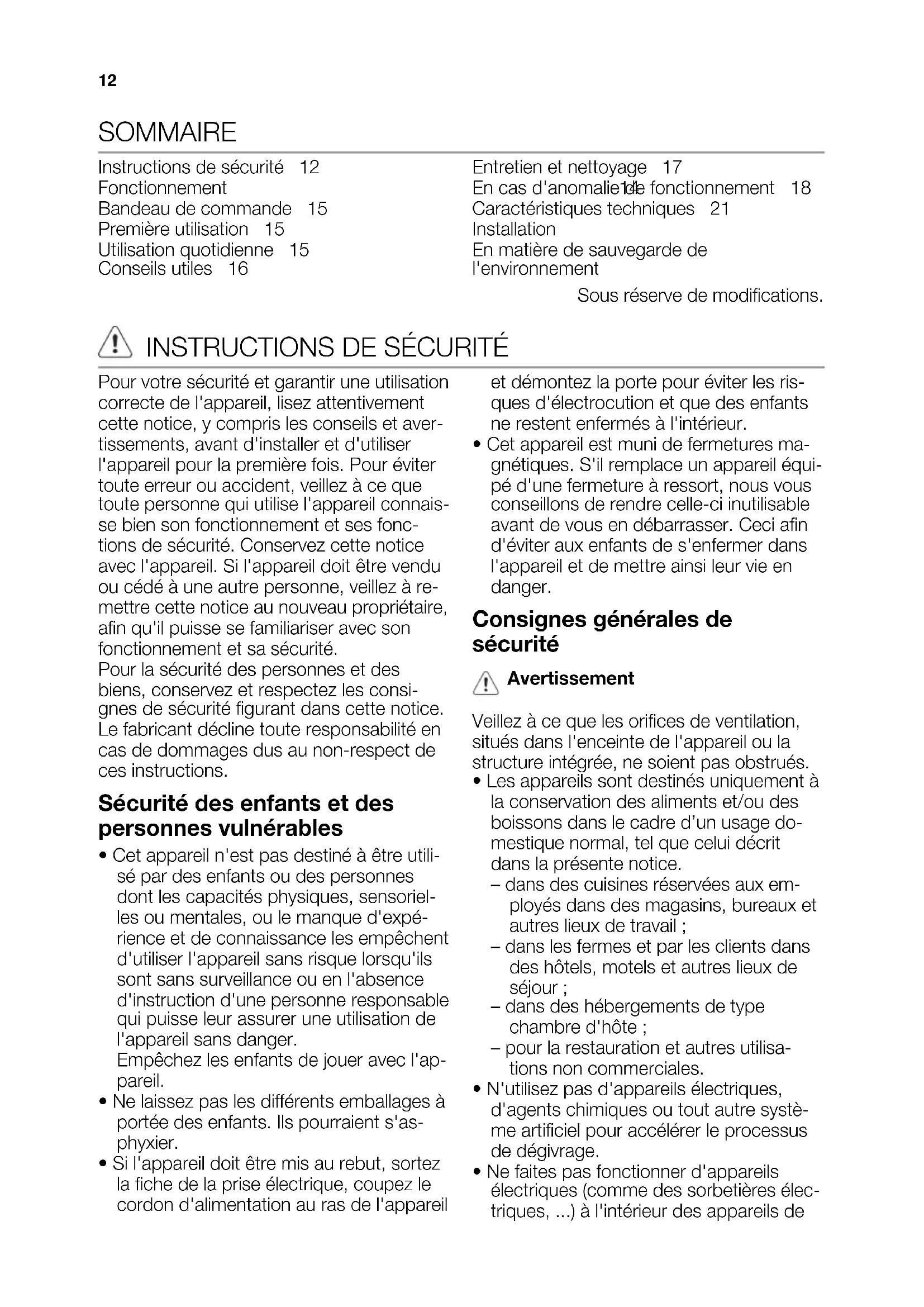 Pour votre sécurité et garantir une utilisation correcte de l'appareil, lisez attentivement cette notice, y compris les conseils et aver- tissements, avant d'installer et d'utiliser l'appareil pour la première fois. Pour éviter toute erreur ou accident, veillez à ce que toute personne qui utilise l'appareil connais- se bien son fonctionnement et ses fonc- tions de sécurité. Conservez cette notice avec l'appareil. Si l'appareil doit être vendu ou cédé à une autre personne, veillez à re- mettre cette notice au nouveau propriétaire, afin qu'il puisse se familiariser avec son fonctionnement et sa sécurité. Pour la sécurité des personnes et des biens, conservez et respectez les consi- gnes de sécurité figurant dans cette notice. Le fabricant décline toute responsabilité en cas de dommages dus au non-respect de ces instructions. Sécurité des enfants et des personnes vulnérables