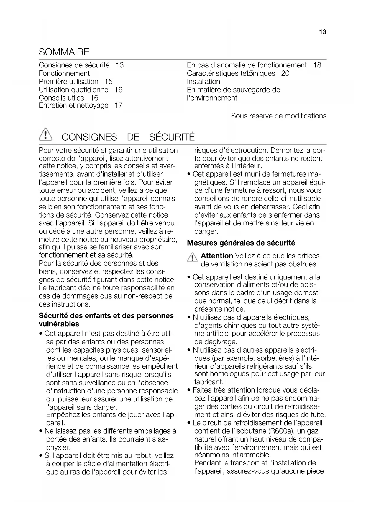 - Cet appareil est muni de fermetures ma- gnétiques. S'il remplace un appareil équi- pé d'une fermeture à ressort, nous vous conseillons de rendre celle-ci inutilisable avant de vous en débarrasser. Ceci afin d'éviter aux enfants de s'enfermer dans l'appareil et de mettre ainsi leur vie en danger. Mesures générales de sécurité Attention Veillez à ce que les orifices de ventilation ne soient pas obstrués.