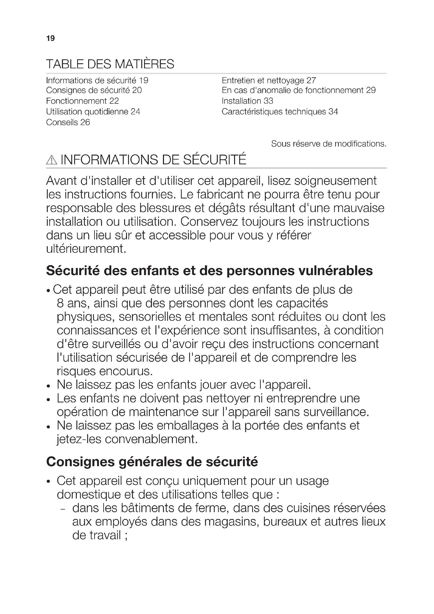 Informations de sécurité 19 Consignes de sécurité 20 Fonctionnement 22 Utilisation quotidienne 24 Conseils 26 Entretien et nettoyage 27 En cas d'anomalie de fonctionnement 29 Installation 33 Caractéristiques techniques 34 Sous réserve de modifications.