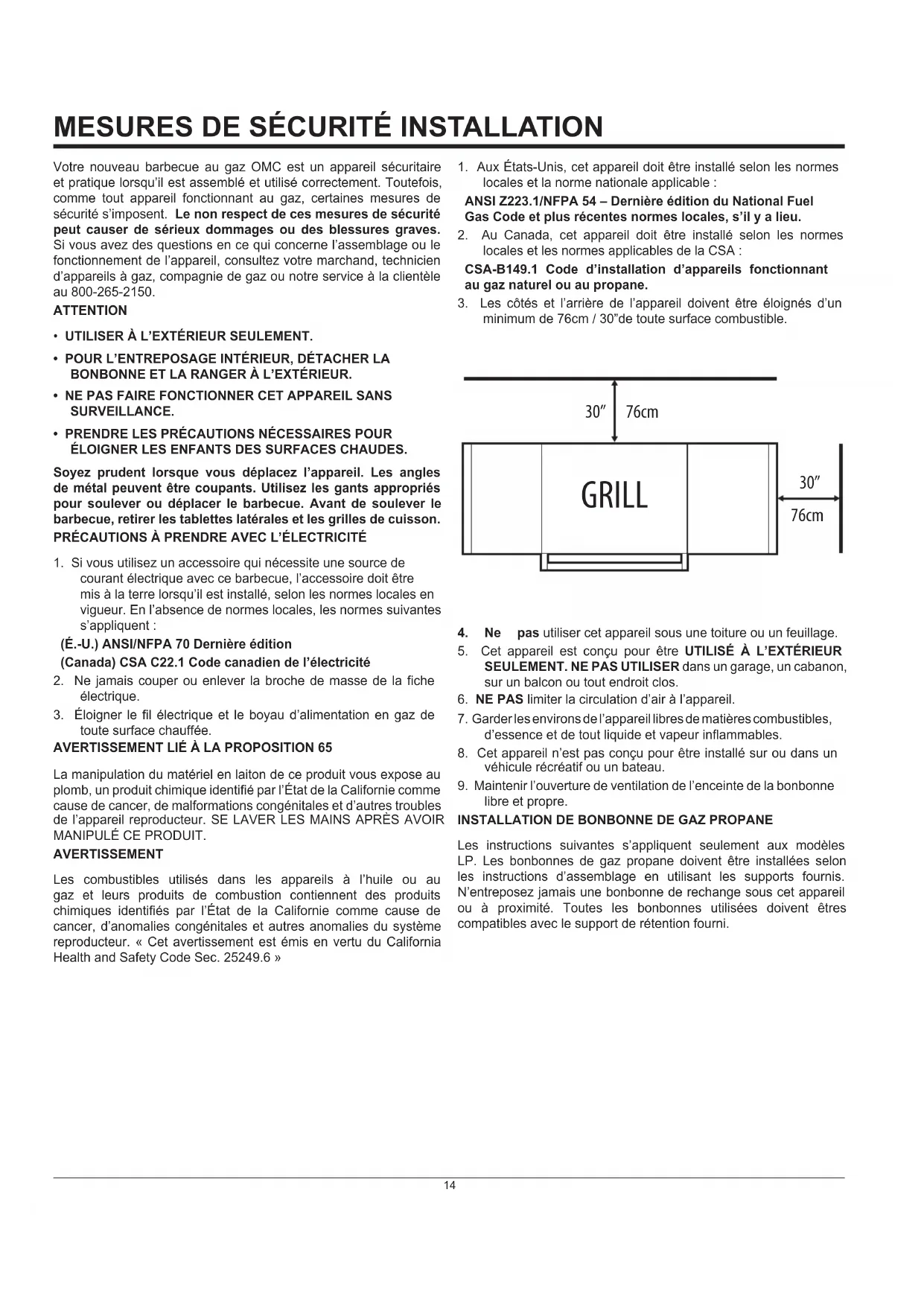CSA-B149.1 Code d'installation d'appareils fonctionnant au gaz naturel ou au propane. - Les cotés et l'arrière de l'appareil doivent être éloignés d'un minimum de 76cm / 30"de toute surface combustible.