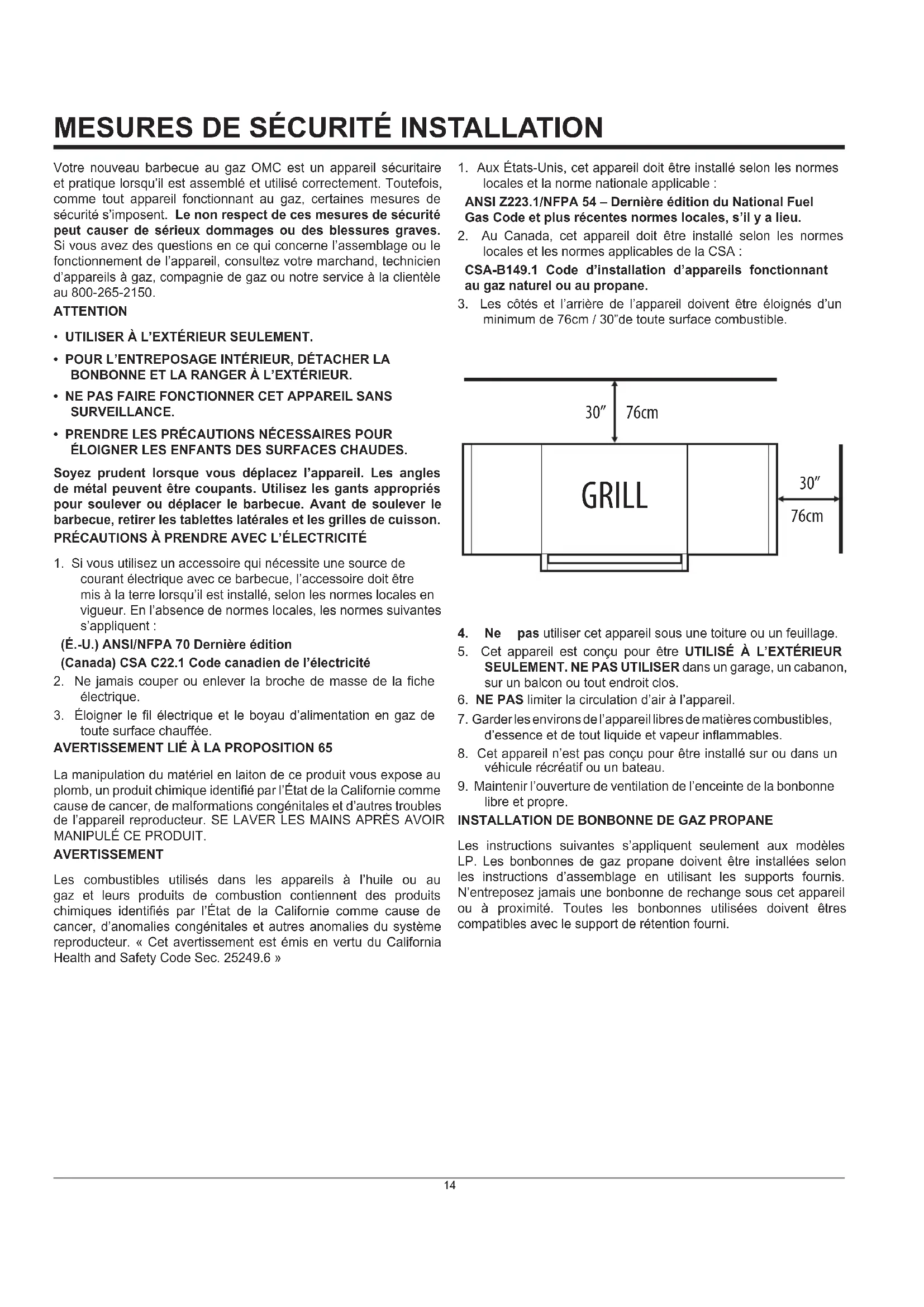 Votre nouveau barbecue au gaz OMC est un appareil sécuritaire et pratique lorsqu’il est assemblé et utilisé correctement. Toutefois, comme tout appareil fonctionnant au gaz, certaines mesures de sécurité s’imposent. Le non respect de ces mesures de sécurité peut causer de sérieux dommages ou des blessures graves. Si vous avez des questions en ce qui concerne l’assemblage ou le fonctionnement de l’appareil, consultez votre marchand, technicien d’appareils à gaz, compagnie de gaz ou notre service à la clientèle au 800-265-2150. ATTENTION