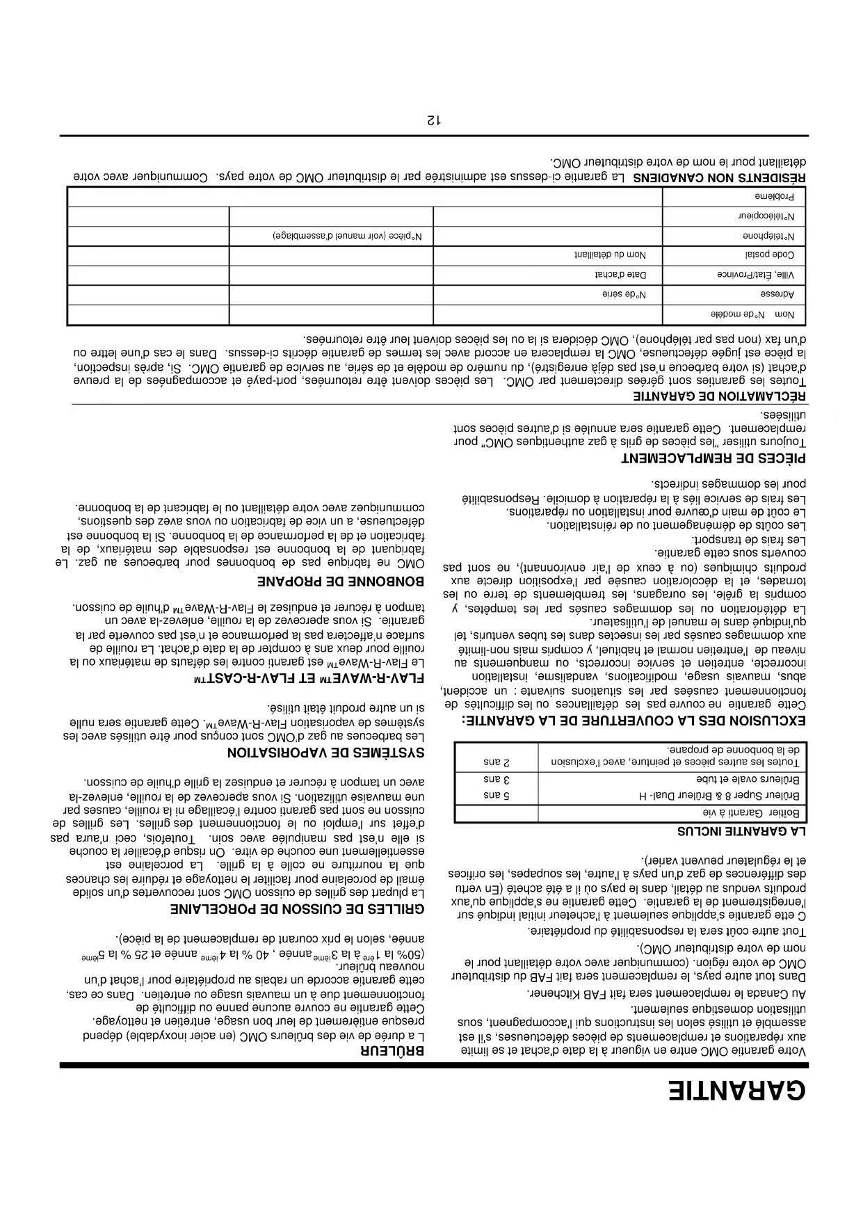 Toutes les garanties sont gérées directement par OMC. Les pièces doivent être retournées, port-payé et accompagnées de la preuve d'achat (si votre barbecue n’est pas déjà enregistré), du numéro de modèle et de série, au service de garantie OMC. Si, après inspection, la pièce est jugée défectueuse, OMC la remplacera en accord avec les termes de garantie décrits ci-dessus. Dans le cas d'une lettre ou d'un fax (non pas par téléphone), OMC décidera si la ou les pièces doivent leur être retournées. Nom N° de modèle Adresse N° de série Ville, État/Province Date d'achat Code postal Nom du détaillant N° téléphone N° pièce (voir manuel d'assemblage) N° télécopieur Problème RÉSIDENTS NON CANADIENS La garantie ci-dessus est administrée par le distributeur OMC de votre pays. Communiquer avec votre détaillant pour le nom de votre distributeur OMC.11