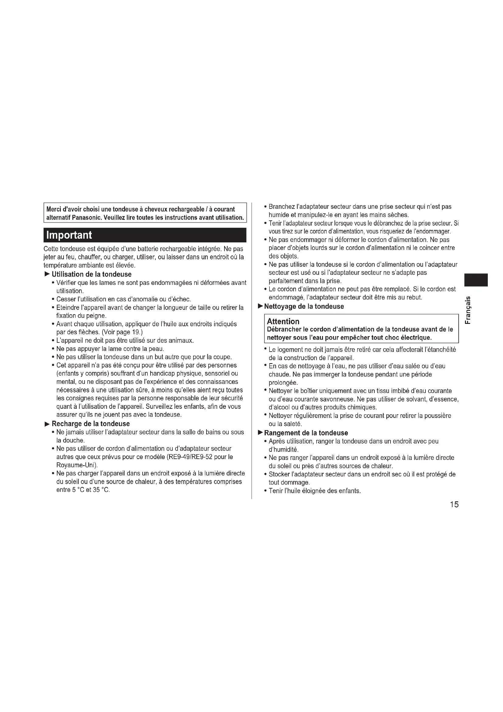 Merci d’avoir choisi une tondeuse à cheveux rechargeable / à courant alternatif Panasonic. Veuillez lire toutes les instructions avant utilisation. Important Cette tondeuse est équipée d’une batterie rechargeable intégrée. Ne pas jeter au feu, chauffer, ou charger, utiliser, ou laisser dans un endroit où la température ambiante est élevée. Utilisation de la tondeuse Vérier que les lames ne sont pas endommagées ni déformées avant utilisation. Cesser l’utilisation en cas d’anomalie ou d’échec. Eteindre l’appareil avant de changer la longueur de taille ou retirer la xation du peigne. Avant chaque utilisation, appliquer de l’huile aux endroits indiqués par des èches. (Voir page 19.) L’appareil ne doit pas être utilisé sur des animaux. Ne pas appuyer la lame contre la peau. Ne pas utiliser la tondeuse dans un but autre que pour la coupe. Cet appareil n’a pas été conçu pour être utilisé par des personnes (enfants y compris) souffrant d’un handicap physique, sensoriel ou mental, ou ne disposant pas de l’expérience et des connaissances nécessaires à une utilisation sûre, à moins qu’elles aient reçu toutes les consignes requises par la personne responsable de leur sécurité quant à l’utilisation de l’appareil. Surveillez les enfants, an de vous assurer qu’ils ne jouent pas avec la tondeuse. Recharge de la tondeuse Ne jamais utiliser l’adaptateur secteur dans la salle de bains ou sous la douche. Ne pas utiliser de cordon d’alimentation ou d’adaptateur secteur autres que ceux prévus pour ce modèle (RE9‑49/RE9‑52 pour le Royaume‑Uni). Ne pas charger l’appareil dans un endroit exposé à la lumière directe du soleil ou d’une source de chaleur, à des températures comprises entre 5 °C et 35 °C.