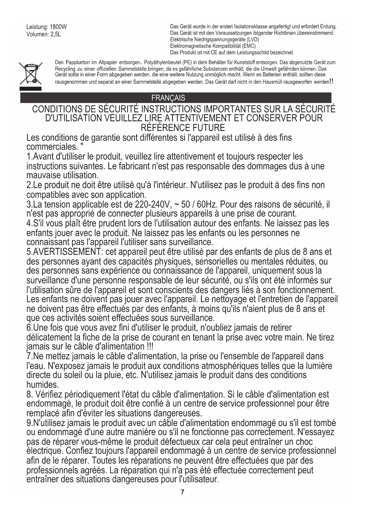 endommagé, le produit doit être confié à un centre de service professionnel pour être remplacé afin d'éviter les situations dangereuses. 7.Ne mettez jamais le câble d'alimentation, la prise ou l'ensemble de l'appareil dans l'eau. N'exposez jamais le produit aux conditions atmosphériques telles que la lumière directe du soleil ou la pluie, etc. N'utilisez jamais le produit dans des conditions humides. CONDITIONS DE SÉCURITÉ INSTRUCTIONS IMPORTANTES SUR LA SÉCURITÉ D'UTILISATION VEUILLEZ LIRE ATTENTIVEMENT ET CONSERVER POUR