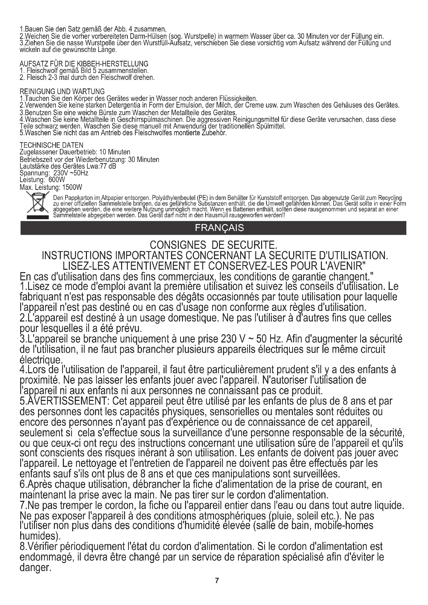 En cas d'utilisation dans des fins commerciaux, les conditions de garantie changent." 1.Lisez ce mode d'emploi avant la première utilisation et suivez les conseils d'utilisation. Le fabriquant n'est pas responsable des dégâts occasionnés par toute utilisation pour laquelle l'appareil n'est pas destiné ou en cas d'usage non conforme aux règles d'utilisation. 2.L'appareil est destiné à un usage domestique. Ne pas l'utiliser à d'autres fins que celles pour lesquelles il a été prévu. 3.L'appareil se branche uniquement à une prise 230 V ~ 50 Hz. Afin d'augmenter la sécurité de l'utilisation, il ne faut pas brancher plusieurs appareils électriques sur le même circuit électrique. 4.Lors de l'utilisation de l'appareil, il faut être particulièrement prudent s'il y a des enfants à proximité. Ne pas laisser les enfants jouer avec l'appareil. N'autoriser l'utilisation de l'appareil ni aux enfants ni aux personnes ne connaissant pas ce produit. 5.AVERTISSEMENT: Cet appareil peut être utilisé par les enfants de plus de 8 ans et par des personnes dont les capacités physiques, sensorielles ou mentales sont réduites ou encore des personnes n'ayant pas d'expérience ou de connaissance de cet appareil, seulement si cela s'effectue sous la surveillance d'une personne responsable de la sécurité, ou que ceux-ci ont reçu des instructions concernant une utilisation sûre de l'appareil et qu'ils sont conscients des risques inérant à son utilisation. Les enfants de doivent pas jouer avec l'appareil. Le nettoyage et l'entretien de l'appareil ne doivent pas être effectués par les enfants sauf s'ils ont plus de 8 ans et que ces manipulations sont surveillées. 6.Après chaque utilisation, débrancher la fiche d'alimentation de la prise de courant, en maintenant la prise avec la main. Ne pas tirer sur le cordon d'alimentation. 7.Ne pas tremper le cordon, la fiche ou l'appareil entier dans l'eau ou dans tout autre liquide. Ne pas exposer l'appareil à des conditions atmosphériques (pluie, soleil etc.). Ne pas l'utiliser non plus dans des conditions d'humidité élevée (salle de bain, mobile-homes humides). 8.Vérifier périodiquement l'état du cordon d'alimentation. Si le cordon d'alimentation est endommagé, il devra être changé par un service de réparation spécialisé afin d'éviter le danger.8 9.Ne pas utiliser l'appareil si le cordon d'alimentation est endommagé, si l'appareil est tombé ou qu'il a été endommagé de quelqu'autre manière ou au cas où il ne fonctionne pas correctement. Ne pas réparer l'appareil soi-même car cela présente un risque d'électrocution. Un appareil endommagé doit être remis chez un professionnel pour vérification ou réparation. Toute réparation doit être effectuée par un service de réparation agréé. Une réparation mal effectuée peut constituer un danger non négligeable pour l'utilisateur.