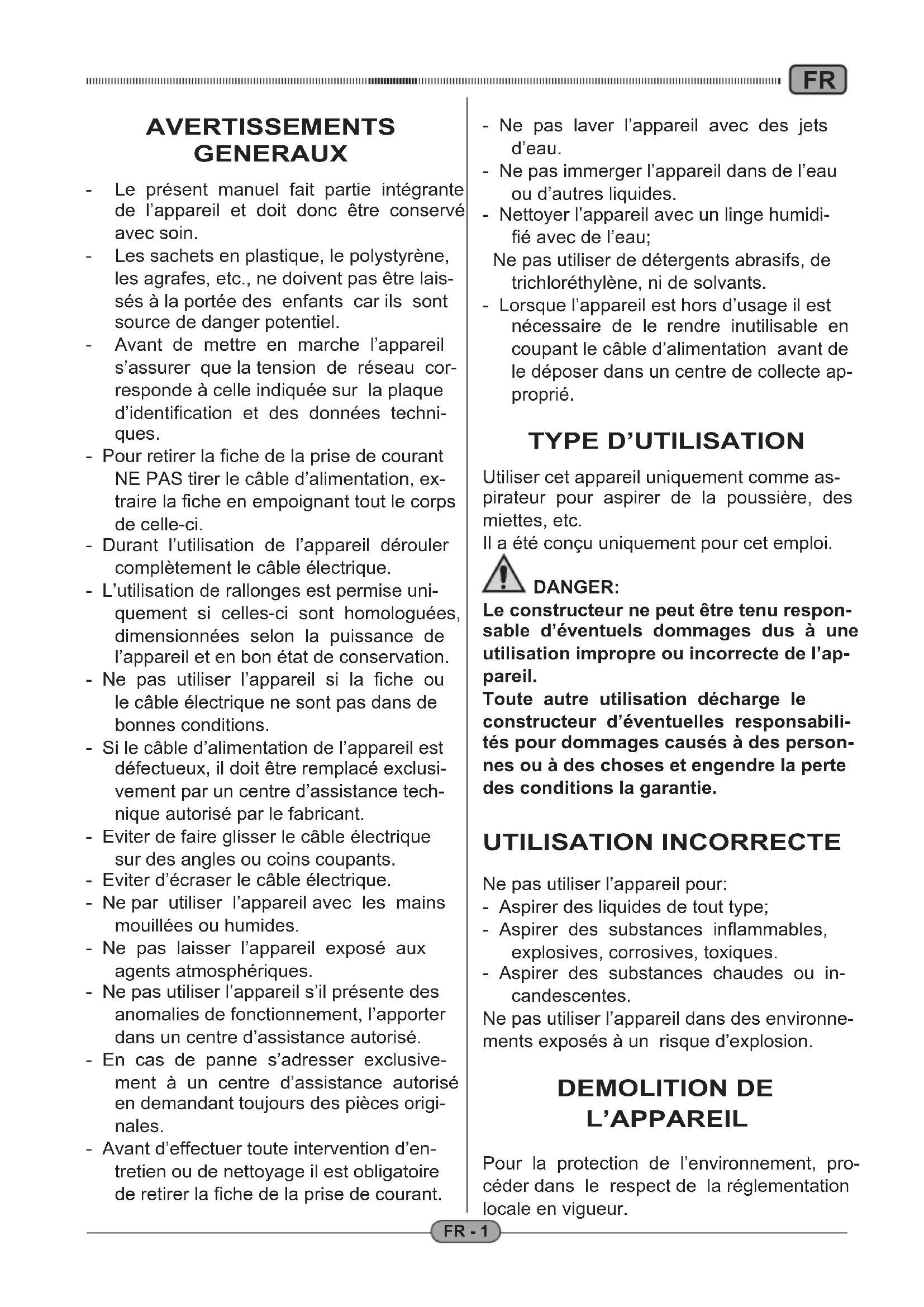 Le constructeur ne peut être tenu responsable d'éventuels dommages dus à une utilisation impropre ou incorrecte de l'appareil.