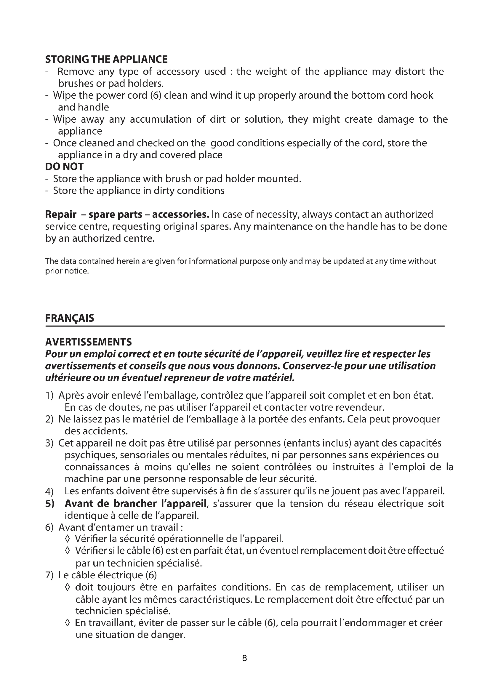 8) Débrancher toujours la prise du secteur pour remplaçer des accessoires, nettoyer la machine, faire la manutention ou des réparations. 9) À la fin du travail, arrêté le moteur, débrancher la prise du secteur en évitant de tirer sur le cable. 10) En cas de dysfonctionnement, débrancher l'appareil et contacter un revendeur autorisé qui vous fournir des pieces de rechange d'origine. 11) Emploi : n'utilisez l'appareil que pour l'usage prévu par le fabricant. Ce dernier ne pourra être tenu responsable des dommages causés par un usage impropre de l'appareil. 12) N'utilisez pas la machine pour le nettoyage à l'extérieur. 13) La machine ne convient pas pour enlever ou travailler en presence de : matieres inflammables, liquides explosifs, gaz dangereux, poussieres toxiques. 14) l'opérateur responsable doit s'assurer que seul des personnes autorisées emploient la machine. 15) Uniquement des personnes formées et qui connaissent les risques peuvent utiliser, faire la manutention et réparer la machine. 16) Toute modification à la machine, sans autorisation du constructeur, en annule la responsabilité 17) Cet apparéil a été concu pour être utilisé avec les accessoires (porte disques, brosses et pads) recommandées par le fabricant. L'utilisation d'accessoires différents peut affecter la sécurité de fonctionnement. Le fabricant décline toute responsabilité de dommages qui en découlent. Eventuels risques sont entièrement à charge de l'utilisateur.