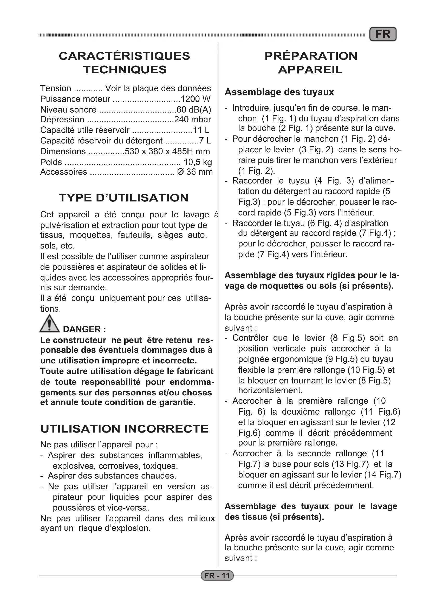 Le constructeur ne peut être retenu res- ponsable des éventuels dommages dus à une utilisation impropre et incorrecte. Toute autre utilisation dégage le fabricant de toute responsabilité pour endomma- gements sur des personnes et/ou choses et annule toute condition de garantie. UTILISATION INCORRECTE Ne pas utiliser l’appareil pour : - Aspirer des substances inflammables, explosives, corrosives, toxiques. - Aspirer des substances chaudes. - Ne pas utiliser l’appareil en version as- pirateur pour liquides pour aspirer des poussières et vice-versa. Ne pas utiliser l’appareil dans des milieux ayant un risque d’explosion. PRÉPARATION APPAREIL Assemblage des tuyaux - Introduire, jusqu’en fin de course, le man- chon (1 Fig. 1) du tuyau d’aspiration dans la bouche (2 Fig. 1) présente sur la cuve. - Pour décrocher le manchon (1 Fig. 2) dé- placer le levier (3 Fig. 2) dans le sens ho- raire puis tirer le manchon vers l’extérieur (1 Fig. 2). - Raccorder le tuyau (4 Fig. 3) d’alimen- tation du détergent au raccord rapide (5 Fig.3) ; pour le décrocher, pousser le rac- cord rapide (5 Fig.3) vers l’intérieur. - Raccorder le tuyau (6 Fig. 4) d’aspiration du détergent au raccord rapide (7 Fig.4) ; pour le décrocher, pousser le raccord ra- pide (7 Fig.4) vers l’intérieur. Assemblage des tuyaux rigides pour le la- vage de moquettes ou sols (si présents). Après avoir raccordé le tuyau d’aspiration à la bouche présente sur la cuve, agir comme suivant : - Contrôler que le levier (8 Fig.5) soit en position verticale puis accrocher à la poignée ergonomique (9 Fig.5) du tuyau flexible la première rallonge (10 Fig.5) et la bloquer en tournant le levier (8 Fig.5) horizontalement. - Accrocher à la première rallonge (10 Fig. 6) la deuxième rallonge (11 Fig.6) et la bloquer en agissant sur le levier (12 Fig.6) comme il décrit précédemment pour la première rallonge. - Accrocher à la seconde rallonge (11 Fig.7) la buse pour sols (13 Fig.7) et la bloquer en agissant sur le levier (14 Fig.7) comme il est décrit précédemment. Assemblage des tuyaux pour le lavage des tissus (si présents). Après avoir raccordé le tuyau d’aspiration à la bouche présente sur la cuve, agir comme suivant :ITFR FR - 12 - Contrôler que le levier (8 Fig.8) soit en position verticale puis accrocher à la poi- gnée ergonomique (9 Fig.8) la buse pour tissus (15 Fig.8) et la bloquer en tournant le levier (8 Fig.8) horizontalement. Assemblage des tuyaux professionnels pour le lavage des tissus (si présents). Après avoir raccordé le tuyau d’aspiration à la bouche présente sur la cuve, agir comme suivant : - Introduire la buse des tissus (16 Fig.9) dans le tuyau flexible (17 Fig.9). - Raccorder le tuyau du détergent (18 Fig.9) au raccord rapide (19 Fig.9) pré- sent sur le tuyau flexible ; pour le décro- cher, pousser le raccord rapide (19 Fig.9) vers le tuyau. Remplissage réservoir du détergent - Retirer le bouchon (20 Fig.10), verser dans le réservoir (21 Fig.10) le liquide détergent adapté à la surface à laver. REMARQUE : Pour le dosage du détergent, se référer aux instructions du producteur. - Remonter le bouchon (20 Fig.10) UTILISATION DE L’APPAREIL - L’appareil est doté de roues et peut donc être traîné durant l’emploi en utilisant di- rectement le tuyau flexible. - Pour le soulever, introduire les doigts de la main dans la poignée prévue à cet effet (22 Fig.11) fixée sur la partie supérieure du couvercle. Démarrage de l’appareil - Insérer la fiche (23 Fig.12) dans la prise de courant. - Mettre l’interrupteur (24 Fig.13) sur “I” pour démarrer le moteur d’aspiration, l’in- terrupteur s’allume. - Mettre l’interrupteur (25 Fig.13) sur “I” pour démarrer la pompe du détergent, l’interrupteur s’allume. REMARQUE : Le fonctionnement du moteur d’aspiration et de la pompe du détergent sont indépen- dants, il est donc possible de : - effectuer le lavage des tissus ou des sols /moquettes en démarrant uniquement la pompe du détergent ; - laver et aspirer en même temps le liquide en démarrant simultanément la pompe de détergent et l’aspiration ; - aspirer les liquides en démarrant seule- ment le moteur d’aspiration. REMARQUE : Pour la poignée ergonomique (si présente) il est possible de régler la force d’aspiration en agissant sur le sélecteur (26 Fig.14). En ouvrant le petit clapet (27 Fig.14), on ob- tient une action aspirante moins puissante. Lavage des sols ou des moquettes - Pour le lavage des sols ou moquettes, il est nécessaire de monter le tuyau avec la poignée ergonomique (9 Fig.15), les ral- longes rigides (10 et 11 Fig.15) et la buse pour sols (13 Fig.15), si présents. - Démarrer l’aspiration et la pompe déter- gent en appuyant sur les interrupteurs relatifs (24 - 25 Fig.13). - Appuyer sur le bouton (28 Fig.15) pour pulvériser le détergent, relâcher pour ar- rêter la pulvérisation. Il est possible de bloquer le bouton (28 Fig.15) en position appuyée (pulvérisa- tion du détergent en continu) en dépla- çant le curseur (29 Fig.15) vers le bouton (28 Fig.15). En replaçant le curseur (29 Fig.15) en position initiale, le bouton se libère et la pulvérisation du détergent se bloque. - Le détergent pulvérisé lave le sol / mo- quette et le liquide sale est aspiré dans le réservoir de l’appareil. Pour des sols très sales, il est conseillé de pulvériser le détergent sur la partie sale sans l’aspirer en le laissant agir quelques secondes puis repasser en lavant et en aspirant.FR FR - 13 REMARQUE : Pour éviter la rupture de la pompe du déter- gent, il est conseillé d’arrêter son fonction- nement au moyen de l’interrupteur relatif, lorsque le dosage n’est pas effectué pendant plusieurs minutes. REMARQUE : Quand le réservoir de récupération est plein, le bruit augmente et l’appareil n’aspire plus, éteindre donc l’appareil et vider le réservoir comme il est dé