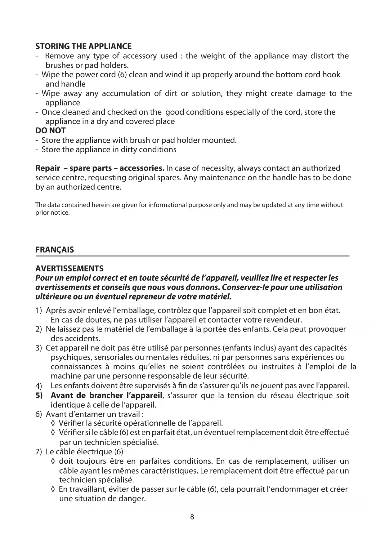 17) Cet apparéil a été concu pour être utilisé avec les accessoires (porte disques, brosses et pads) recommandées par le fabricant. L'utilisation d'accessoires différents peut affecter la sécurité de fonctionnement. Le fabricant décline toute responsabilité de dommages qui en découlent. Eventuels risques sont entièrement à charge de l'utilisateur.