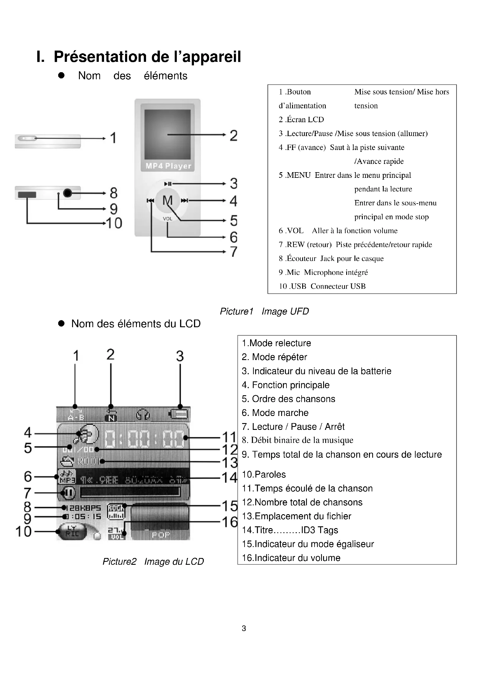 Picture2 Image du LCD 1 .Bouton d’alimentation Mise sous tension/ Mise hors tension 2 .Écran LCD 3 .Lecture/Pause /Mise sous tension (allumer) 4 .FF (avance) Saut à la piste suivante /Avance rapide 5 .MENU Entrer dans le menu principal pendant la lecture Entrer dans le sous-menu principal en mode stop 6 .VOL Aller à la fonction volume 7 .REW (retour) Piste précédente/retour rapide 8 .Écouteur Jack pour le casque 9 .Mic Microphone intégré 10 .USB Connecteur USB 1.Mode relecture