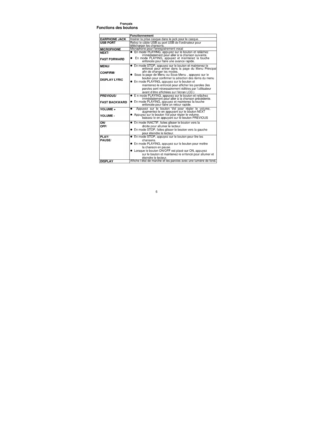 | Mon lecteur ne peut dire les fichiers musique MP3 | La plupart des fichiers musique MP3 sur le marché sont commercialisés en MPEG1, MPEG2, LAYER3 standard. Au début certains morceaux MP3 étaient comprises en MPEG1 LAYER1 et MPEG1 LAYER2. Veuiliez notes que votre lecteur ne supporte pas le MPEG1 LAYER1, MPEG1 LAYER2 ou un mp3 comprése plus d'une fois en standard. | Si le lecteur MP3 ne peut dire les fichiers musiques MP3, passesz au morceau suivant jusqu'à ce que les fichiers musique MP3 ne seront pas comprés en MPEG1 LAYER1 /MPEG1 LAYER2. Effaceze les fichiers qui ne peuvent être lus dans le lecteur. |