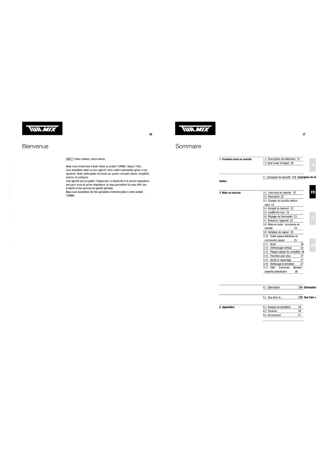 Nous vous remercions d'avoir choisi un produit TURMIX. Depuis 1933, nous travaillons dans un seul objectif: votre entière satisfaction grâce à nos appareils. Notre philosophie est basée sur quatre concepts: Durée, simplicité, charme et confiance. Cela signifie que la qualité, l'ergonomie, la simplicité et le service réparations sont pour nous de prime importance, et nous permettent de vous offrir des produits et des services de qualité optimale. Nous vous souhaitons de très agréables moments grâce à votre produit TURMIX.