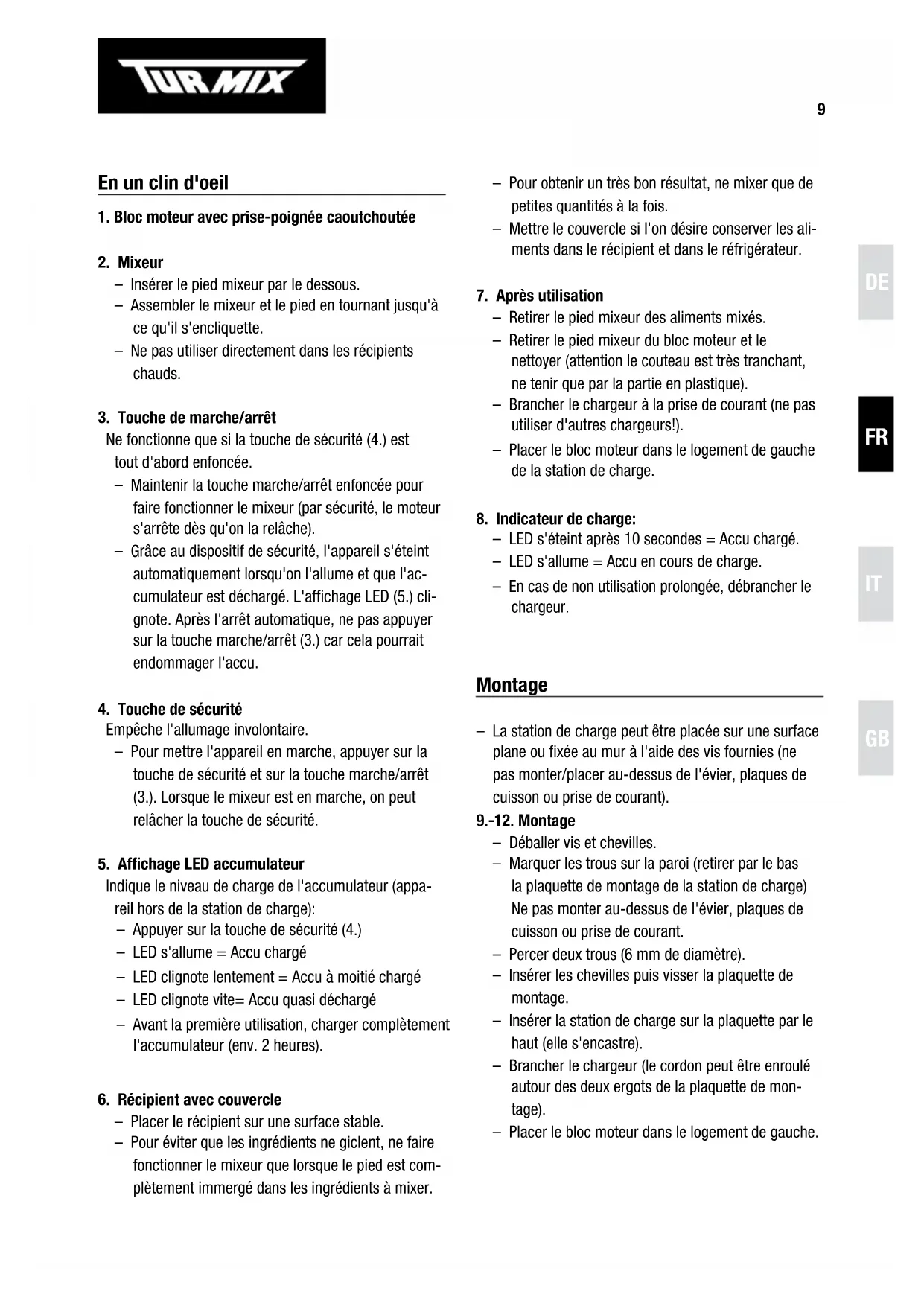 Pour éviter que les ingrédents ne giclent, ne faire fonctionner le mixeur que lorsque le pied est complètement immergé dans les ingrédents à mixer.