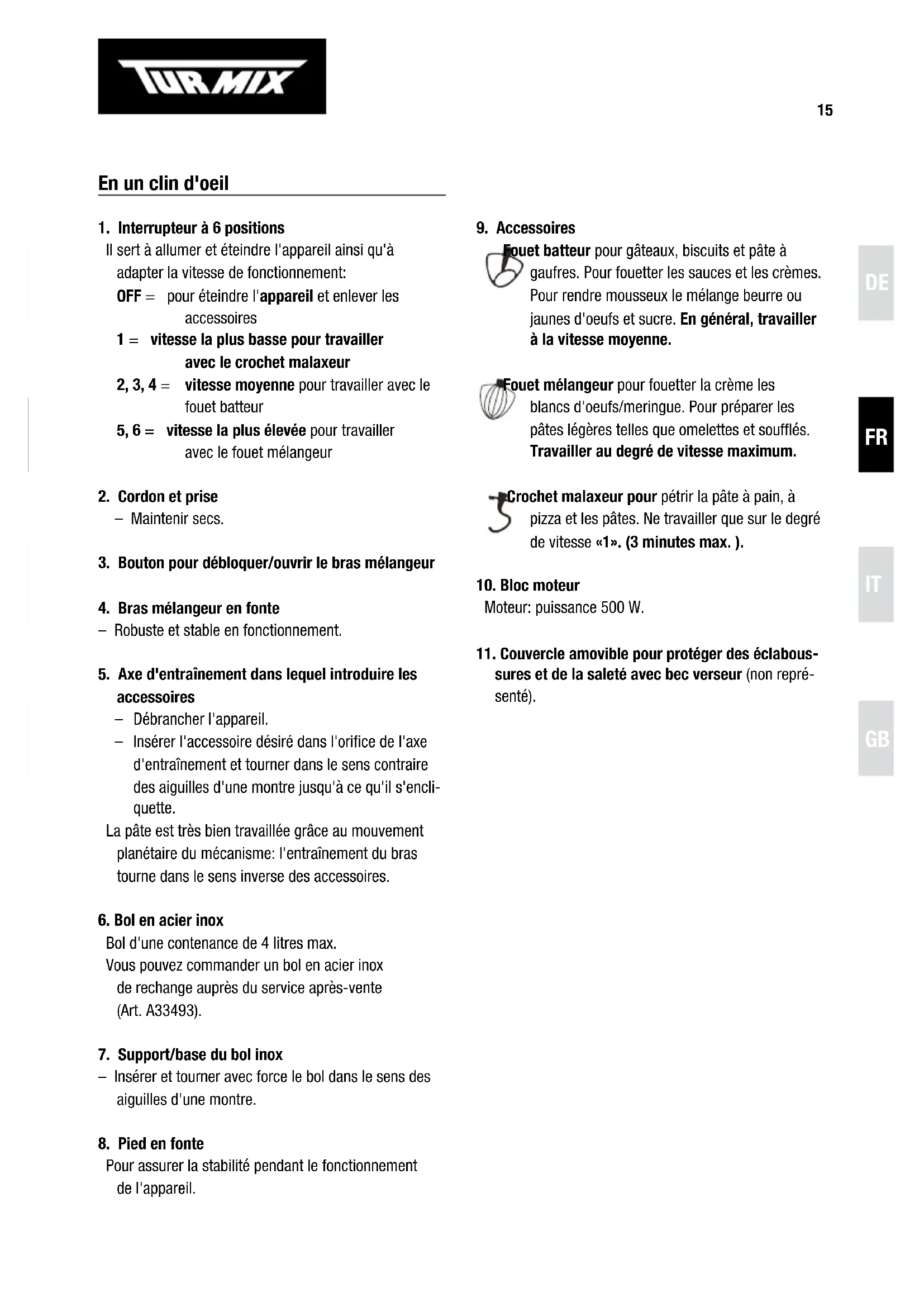 – Insérer l'accessoire désiré sur l'axe d'entraînement (5.) et tourner dans le sens contraire des aiguilles d'une montre jusqu'à ce qu'il s'encliquette. – Placer le bec verseur sur le couvercle et l'accrocher. – Rabattre le bras mélangeur avec une main et de l'autre pousser le bouton (3.), pour bloquer le bras. (le bras s'encliquette en position horizontale). – Pour ouvrir/relever le bras, opérer en sens inverse. Recommandation: – Ne jamais oublier de bien encastrer l'accessoire de façon à ce que celui-ci ne risque pas de se libérer durant le fonctionnement. Allumer l'appareil – Mettre l'interrupteur à 6 positions sur OFF. – Brancher l'appareil. – Verser les ingrédients à travers le bec verseur. Interrupteur à 6 positions – Régler la vitesse en fonction de l'utilisation: Vitesse Fonction Pour 1 malaxer, pétrir pâte à pain, à pizza et à pâtes 2 mélanger doucement crèmes, sauces, pâtes à gâteaux 3-4 fouetter, battre beurre ou jaunes d'oeuf plus sucre, pâtes à gâteaux, biscuits et gaufres 5-6 fouetter la crème et les blancs en neige/ meringue – Une fois le travail terminé, placer l'interrupteur sur OFF et débrancher l'appareil. Libérer l'accessoire en tournant dans le sens des aiguilles d'une montre et l'enlever. Recommandations importantes! – Ne pas trop remplir le bol et ne pas faire fonctionner l'appareil sans interruption plus de 3 minutes. – Ne jamais mettre la main ou introduire cuillère, spatule, etc., lorsque l'appareil est en marche: risque de blessure!