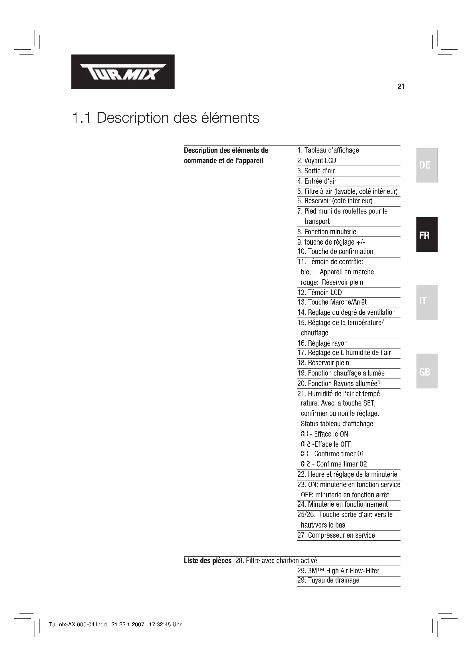 25/26. Touche sortie d‘air: vers le haut/vers le bas 27 Compresseur en service Liste des pièces 28. Filtre avec charbon activé