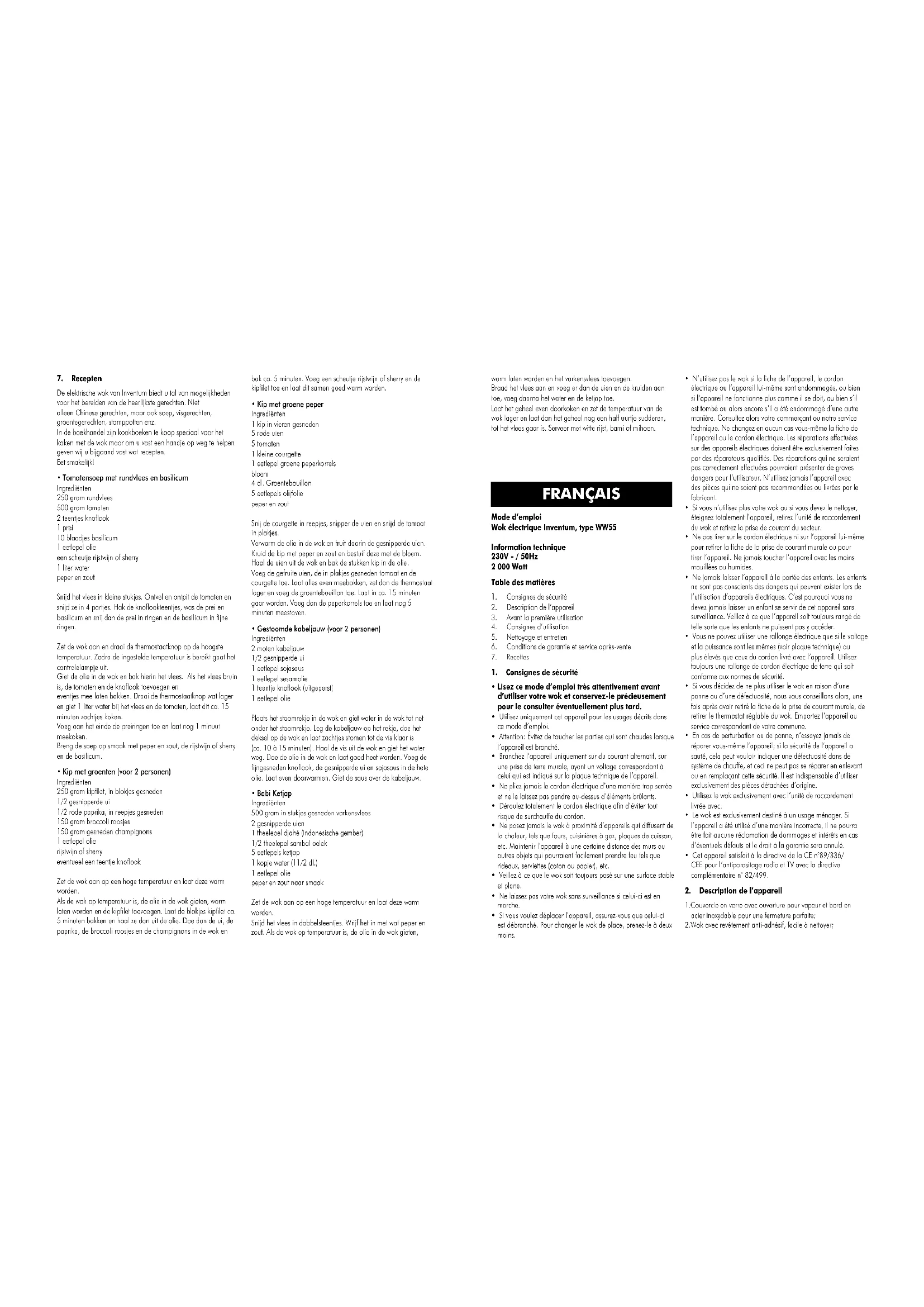 N'utilisez pas le wok si la fiche de l'appareil, le cordon électrique ou l'appareil lui-même sont endommagés, ou bien si l'appareil ne fonctionne plus comme il se doit, ou s'il a été endommagé d'une manière quelconque. Consultez alors un service technique. Ne changez en aucun cas vous-même la fiche de l'appareil ou le cordon électrique. Les réparations effectuées sur des appareils électriques doivent être exclusivement faites par des réparateurs qualifiés. Des réparations qui ne seront pas correctement effectuées pourraient causer de grosses dangers pour l'utilisateur. N'utilisez jamais l'appareil avec des pièces qui ne seront pas recommandées ou livrées par le fabricant. - Si vous utilisez plus ce wok ou si vous devez le recycler, débranchez totalement l'appareil, retirez l'unité de raccordement du wok et refermez la boîte de courant du sécheur. - Ne pas tirer sur le cordon électrique ni sur l'appareil, lui-même pour être la fiche de la prise de courant murale ou pour tirer l'appareil. Ne touchez pas l'appareil avec les mains mouillées ou humides. - Ne laissez jamais l'appareil à la portée des enfants. Les enfants ne sont pas conscients des dangers qui peuvent exister lors de l'utilisation d'appareils électriques. C'est pourquoi vous ne devez jamais laisser un adulte de servir de cet appareil sans surveillance. Veillez que cet appareil soit toujours rangé de sorte que les enfants ne puissent pas y accéder. - Vous ne pouvez utiliser une rallonge électrique que si le voltage et la puissance sont les mêmes [voir notice technique] ou plus élevés que ceux du cordon livré avec l'appareil. Utilisez uniquement une rallonge de cordon électrique qui soit conforme aux normes de sécurité. Si vous décidez de ne plus utiliser le wok ou pour une raison de panne ou d'effet, sous vos conséquences ci-dessus, une fois après avoir retiré la fiche de la prise de courant murale, de retirer le thermostat régulateur du wok. Apportez l'appareil au service correspondant de votre commune. En cas de perturbation ou de pomme, n'essayez jamais de réparer vous-même l'appareil, il saute de l'appareil ou sauf, cela pourrait vous induire une défectuosité du système du chauffe, et donc ne peut-on réparer en ligne ou en renvoi cette sécurité. Il est indispensable d'utiliser exclusivement des pièces détachées d'origine. - Utilisez le wok exclusivement avec l'unité de raccordement livrée avec. - Le wok est exclusivement destiné à un usage domestique. Si l'appareil est une édition d'une multinationale inconnue, il ne pourrait et coll'une réclamation de dommages et intérêts ou cas d'éventuels détails ou le droit à la garantie sera annulé. - Cet appareil satisfait à la directive de la CE n89/336/CEE pour l'antipollution radio et avec la directive complémentaire n 82/499.
