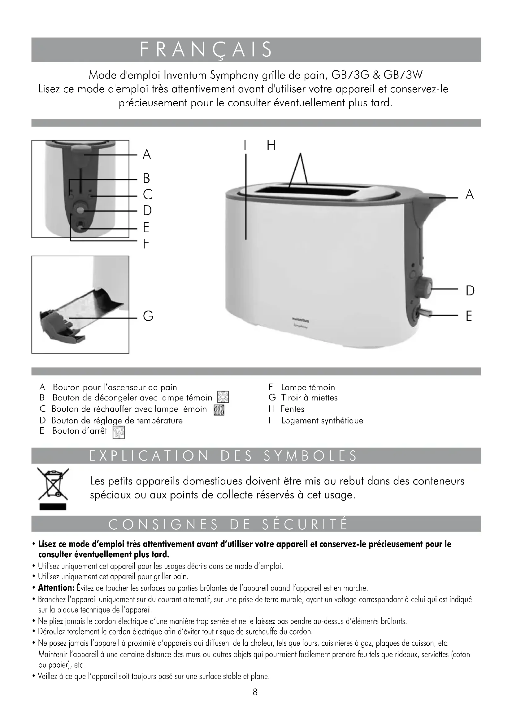 Symphony GB73G - Grille pain INVENTUM - Notice d'utilisation et mode d'emploi gratuit