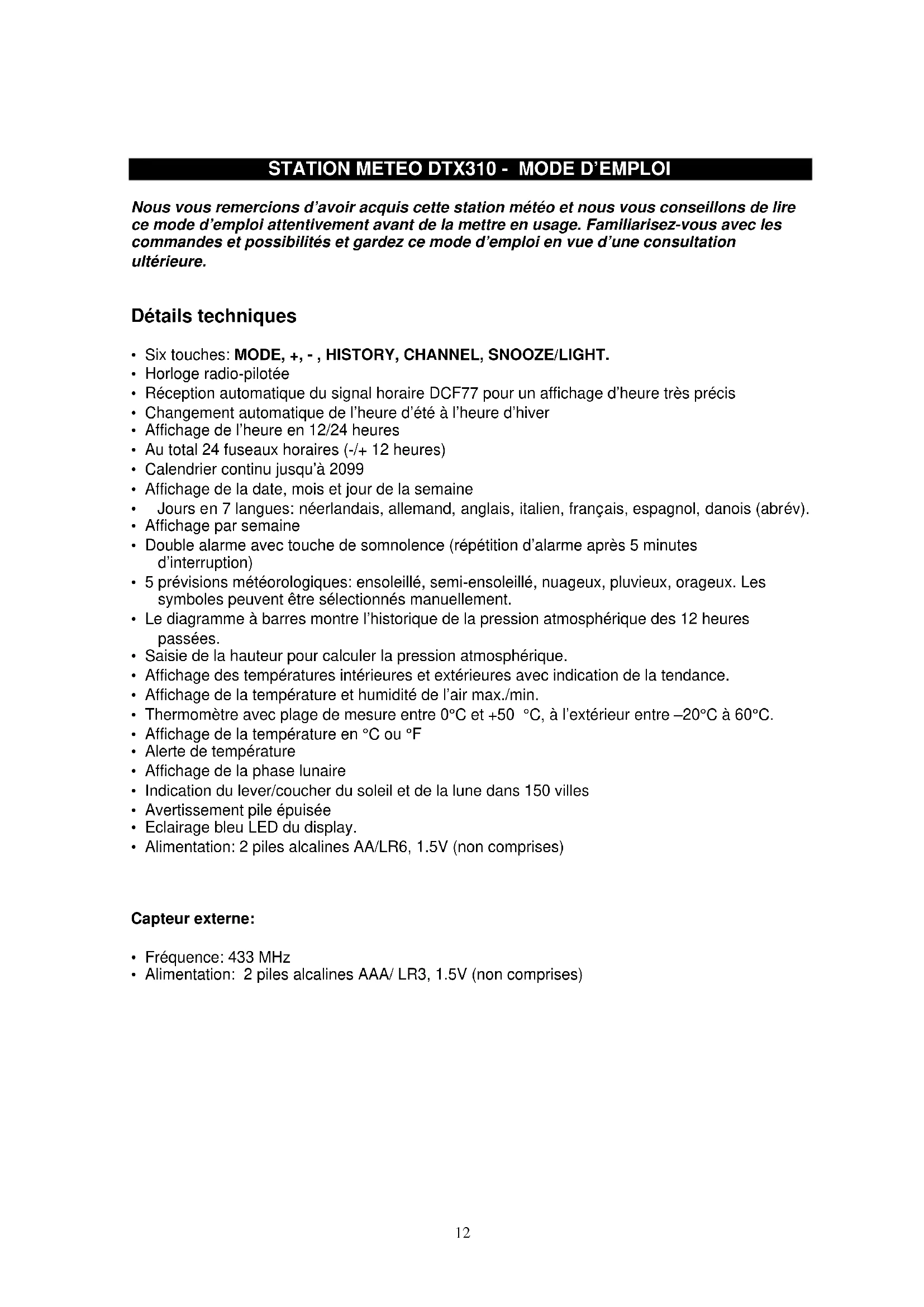 Nous vous remercions d'avoir acquis cette station météo et nous vous conseillons de lire ce mode d'emploi attentivement avant de la mettre en usage. Familiarisez-vous avec les commandes et possibilités et gardez ce mode d'emploi en vue d'une consultation ultérieure.