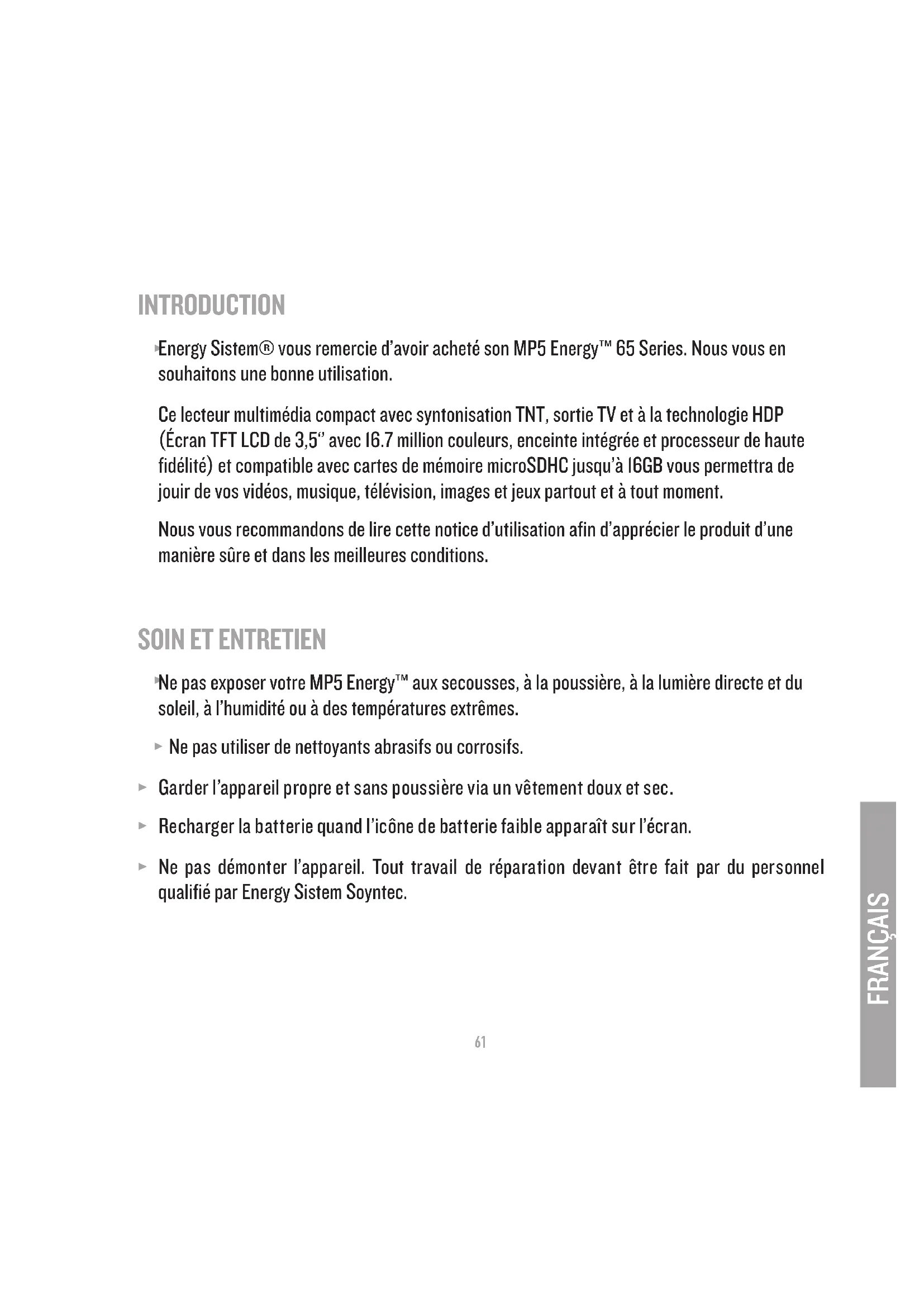 Energy Sistem® vous remercie d’avoir acheté son MP5 Energy™ 65 Series. Nous vous en souhaitons une bonne utilisation. Ce lecteur multimédia compact avec syntonisation TNT, sortie TV et à la technologie HDP (Écran TFT LCD de 3,5‘’ avec 16.7 million couleurs, enceinte intégrée et processeur de haute fidélité) et compatible avec cartes de mémoire microSDHC jusqu’à 16GB vous permettra de jouir de vos vidéos, musique, télévision, images et jeux partout et à tout moment. Nous vous recommandons de lire cette notice d’utilisation afin d’apprécier le produit d’une manière sûre et dans les meilleures conditions.