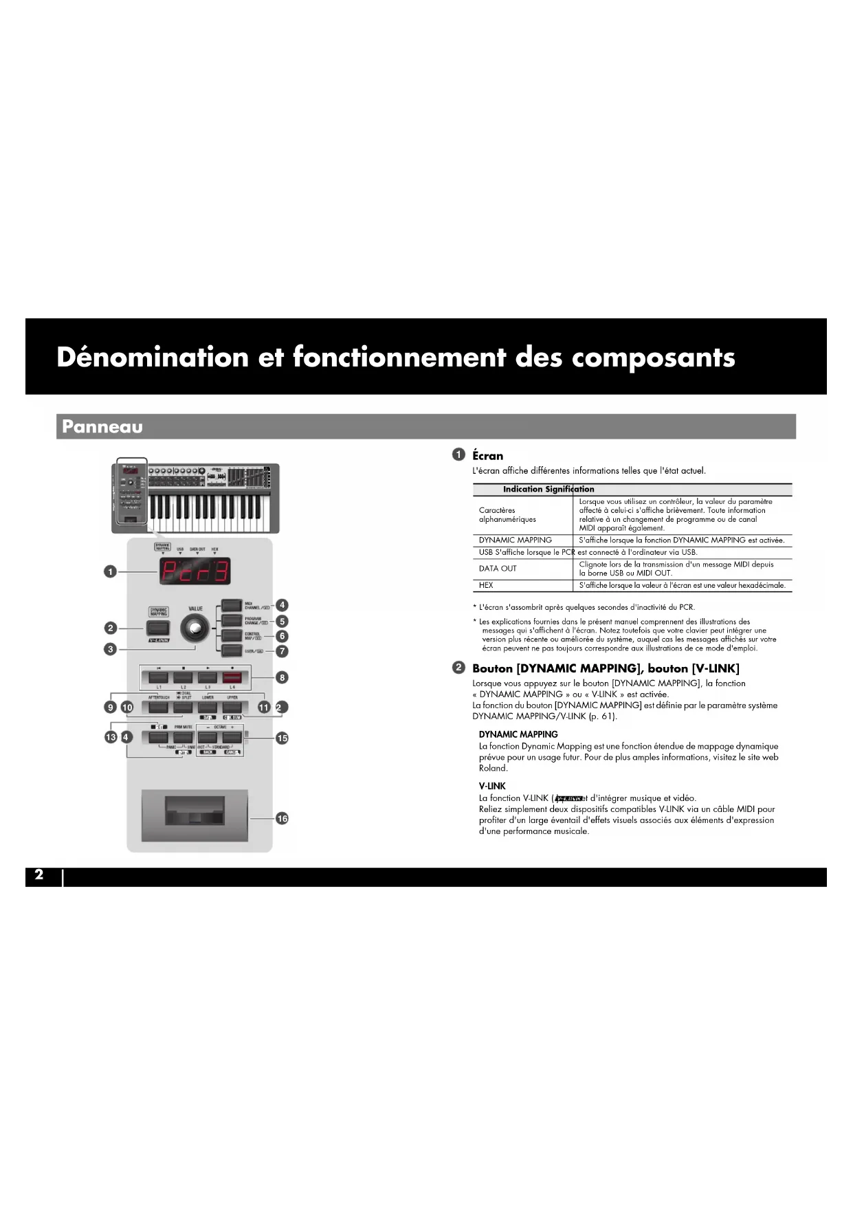 PCR-300_500_800_e.book 1 ページ 2007年2月27日 火曜日 午後12時23分2 Dénomination et fonctionnement des composants fig.Panel-Left.eps Écran L'écran affiche différentes informations telles que l'état actuel.* L'écran s'assombrit après quelques secondes d'inactivité du PCR.* Les explications fournies dans le présent manuel comprennent des illustrations des messages qui s'affichent à l'écran. Notez toutefois que votre clavier peut intégrer une version plus récente ou améliorée du système, auquel cas les messages affichés sur votre écran peuvent ne pas toujours correspondre aux illustrations de ce mode d'emploi. Bouton [DYNAMIC MAPPING], bouton [V-LINK] Lorsque vous appuyez sur le bouton [DYNAMIC MAPPING], la fonction « DYNAMIC MAPPING » ou « V-LINK » est activée. La fonction du bouton [DYNAMIC MAPPING] est définie par le paramètre système DYNAMIC MAPPING/V-LINK (p. 61).DYNAMIC MAPPINGLa fonction Dynamic Mapping est une fonction étendue de mappage dynamique prévue pour un usage futur. Pour de plus amples informations, visitez le site web Roland.V-LINKLa fonction V-LINK ( ) permet d'intégrer musique et vidéo. Reliez simplement deux dispositifs compatibles V-LINK via un câble MIDI pour profiter d'un large éventail d'effets visuels associés aux éléments d'expression d'une performance musicale. Panneau