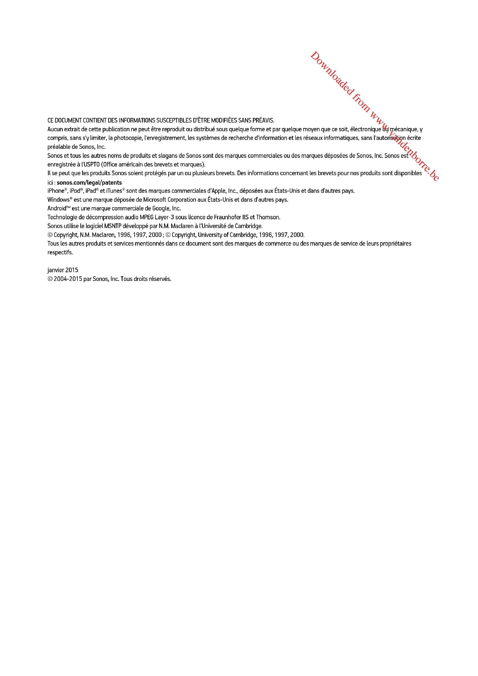 BOOST Guide du produit Downloaded from www.vandenborre.beCE DOCUMENT CONTIENT DES INFORMATIONS SUSCEPTIBLES D’ÊTRE MODIFIÉES SANS PRÉAVIS. Aucun extrait de cette publication ne peut être reproduit ou distribué sous quelque forme et par quelque moyen que ce soit, électronique ou mécanique, y compris, sans s'y limiter, la photocopie, l'enregistrement, les systèmes de recherche d'information et les réseaux informatiques, sans l'autorisation écrite préalable de Sonos, Inc. Sonos et tous les autres noms de produits et slogans de Sonos sont des marques commerciales ou des marques déposées de Sonos, Inc. Sonos est enregistrée à l'USPTO (Office américain des brevets et marques). Il se peut que les produits Sonos soient protégés par un ou plusieurs brevets. Des informations concernant les brevets pour nos produits sont disponibles ici : sonos.com/legal/patents iPhone®, iPod®, iPad® et iTunes® sont des marques commerciales d’Apple, Inc., déposées aux États-Unis et dans d’autres pays. Windows® est une marque déposée de Microsoft Corporation aux États-Unis et dans d’autres pays. Android™ est une marque commerciale de Google, Inc. Technologie de décompression audio MPEG Layer-3 sous licence de Fraunhofer IIS et Thomson. Sonos utilise le logiciel MSNTP développé par N.M. Maclaren à l’Université de Cambridge. © Copyright, N.M. Maclaren, 1996, 1997, 2000 ; © Copyright, University of Cambridge, 1996, 1997, 2000. Tous les autres produits et services mentionnés dans ce document sont des marques de commerce ou des marques de service de leurs propriétaires respectifs. janvier 2015 © 2004-2015 par Sonos, Inc. Tous droits réservés. Downloaded from www.vandenborre.beSonos BOOST™ Le Sonos BOOST est un accessoire en option que vous pouvez acheter pour libérer la pleine puissance de Sonos. Quand devrais-je utiliser un BOOST ?