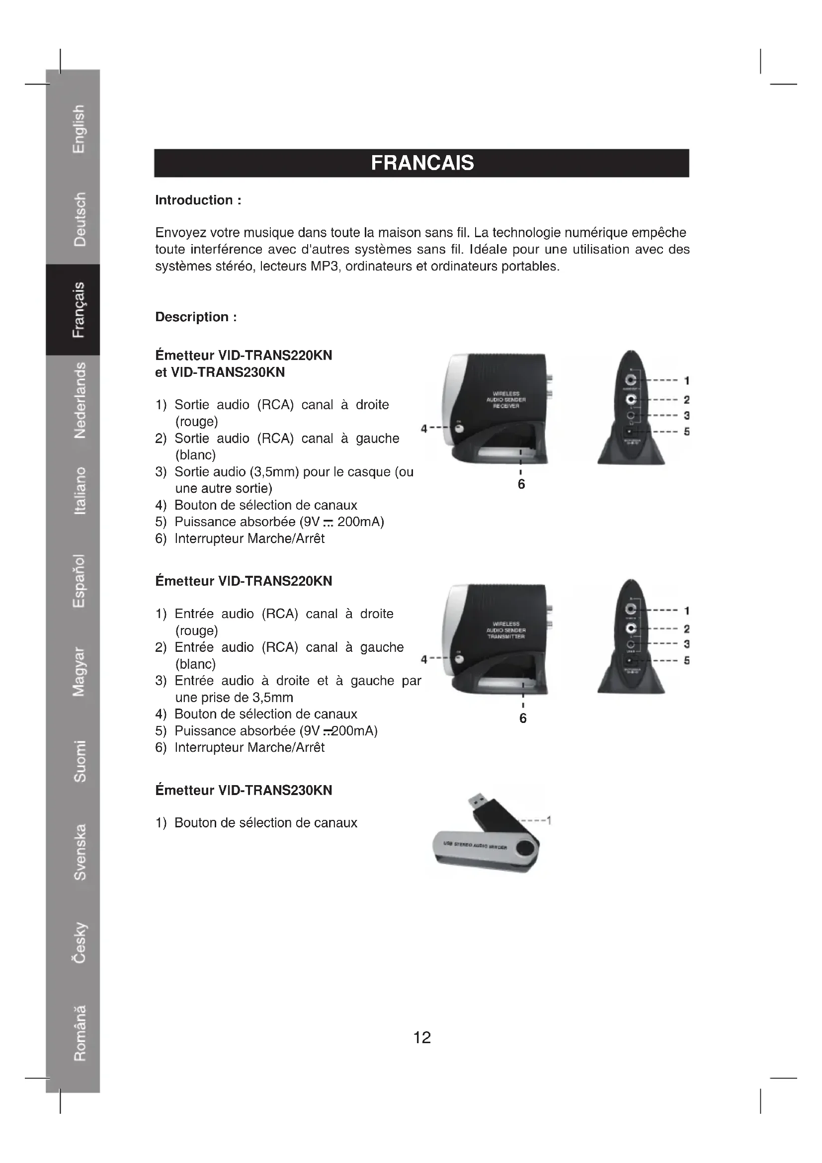 ATTENTION Afin de réduire les risques de chocs électriques, ce produit ne doit être ouvert QUE par un technicien qualifié agréé en cas de réparation. Débranchez l'appareil du secteur et des autres équipements en cas de problème. N'exposez jamais l'appareil à l'eau ou à l'humidité. Entretien : Ne nettoyez qu'avec un chiffon sec. N'utilisez pas de solvants ou de produits abrasifs. Garantie : Aucune garantie ou responsabilité ne sera acceptée en cas de modification et/ou de transformation du produit ou en cas de dommages provoqués par une utilisation incorrecte de l'appareil. Généralités : Le design et les caractéristiques techniques sont sujets à modification sans notification préalable. Tous les logos de marques et noms de produits sont des marques déposées ou immatriculées dont leurs détenteurs sont les propriétaires et sont donc reconnus comme telles dans ce document. Attention : Ce symbole figure sur l'appareil. Il signifie que les produits électriques et électroniques ne doivent pas être jetés avec les déchets domestiques. Le système de collecte est différent pour ce genre de produits. Copyright ©17 NEDERLANDS Introductie: Verstuur uw muziek draadloos door het huis. Digitale technologie voorkomt interferentie door andere draadloze systemen. Ideaal voor gebruik met stereosystemen, MP3-spelers, computers en notebooks. Omschrijving: Ontvangers VID-TRANS220KN en VID-TRANS230KN