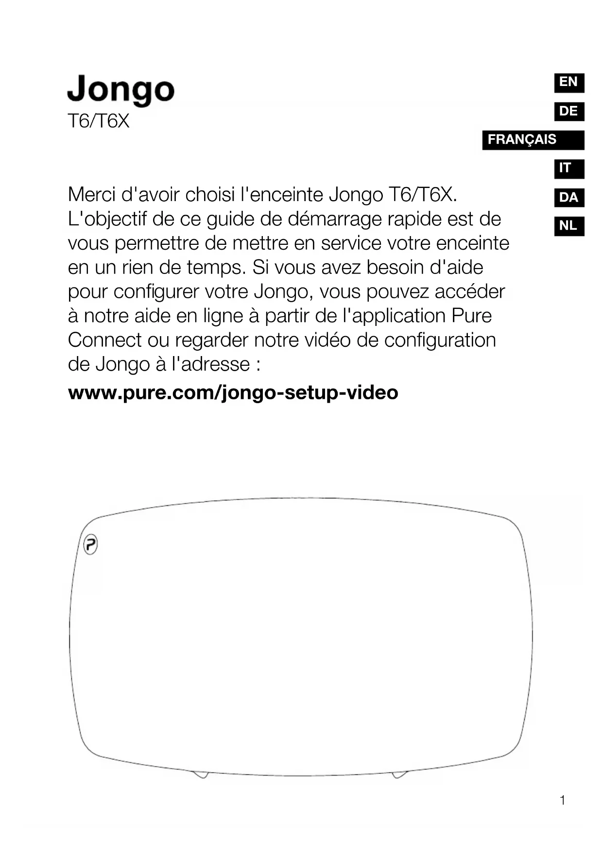 Merci d'avoir choisi l'enceinte Jongo T6/T6X. L'objectif de ce guide de démarrage rapide est de vous permettre de mettre en service votre enceinte en un rien de temps. Si vous avez besoin d'aide pour confi gurer votre Jongo, vous pouvez accéder à notre aide en ligne à partir de l'application Pure Connect ou regarder notre vidéo de configuration de Jongo à l'adresse: www.pure.com/jongo-setup-video T6/T6X Jongo_T6X_QSG-Euro-v2.indb 1 9/16/2014 1:55:35 PM2