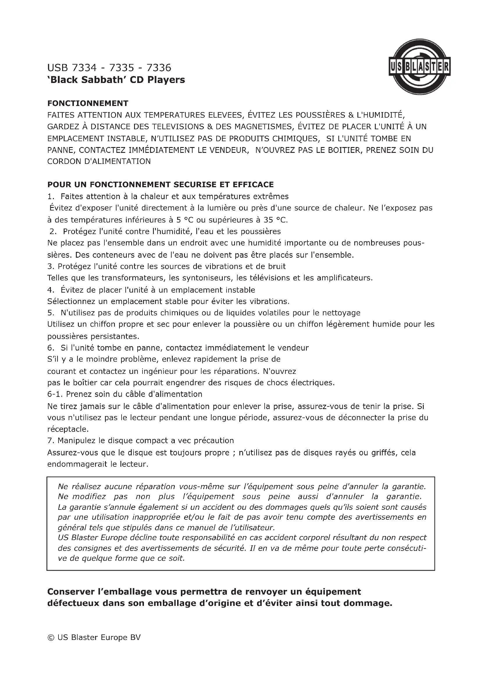 Les règles suivantes s'appliquent à compter du jour où l'équipement quitte l'usine: La date de facture est considérée comme étant la date du début de la garantie. Seules les sociétés agréeses par US Blaster sont autorisées à intervenir sur les équipements. La garantie est invalidée si d'autres techniciens de maintenance ouvrent l'équipement. Durant la période de garantie, un équipement défectieux doit être renvoyé en port payé dans son emballage d'origine. US Blaster renverra les marchandises en port payé durant la première année de garantie; ensuite les coûts de transport sont à la charge du destinataire. Les potentiomètres ont une durée de vie limitee et ne sont couverts par la garantie du fabricant que pour un usage normal. Pour toutes demandes de réparation, reféréz-vous à votre distributeur local, car il est le mieux place pour vous aider.