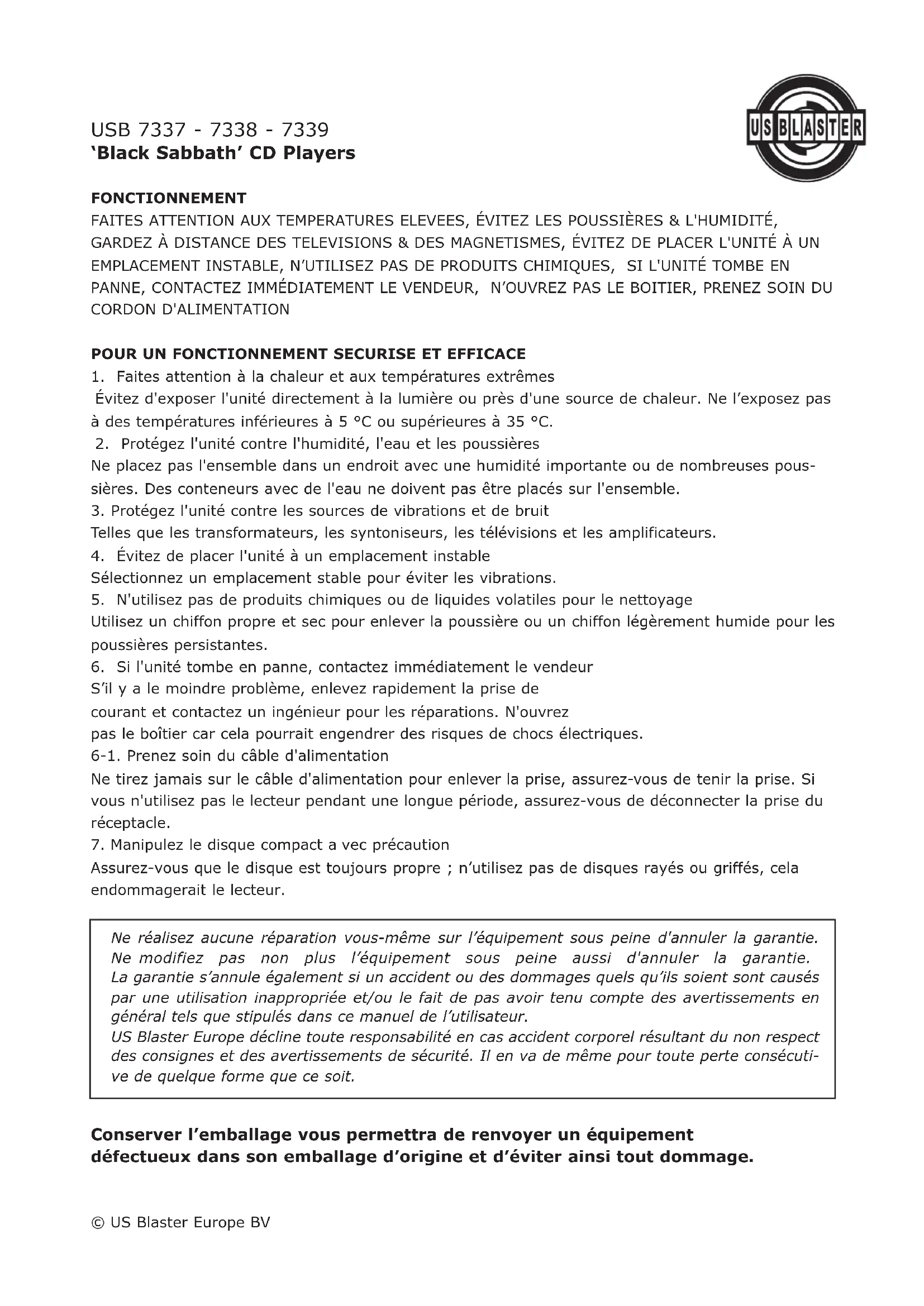 ec précaution Assurez-vous que le disque est toujours propre ; n’utilisez pas de disques rayés ou griffés, cela endommagerait le lecteur. Conserver l’emballage vous permettra de renvoyer un équipement défectueux dans son emballage d’origine et d’éviter ainsi tout dommage. © US Blaster Europe BV Ne réalisez aucune réparation vous-même sur l’équipement sous peine d'annuler la garantie. Ne modifiez pas non plus l’équipement sous peine aussi d'annuler la garantie. La garantie s’annule également si un accident ou des dommages quels qu’ils soient sont causés par une utilisation inappropriée et/ou le fait de pas avoir tenu compte des avertissements en général tels que stipulés dans ce manuel de l’utilisateur. US Blaster Europe décline toute responsabilité en cas accident corporel résultant du non respect des consignes et des avertissements de sécurité. Il en va de même pour toute perte consécuti