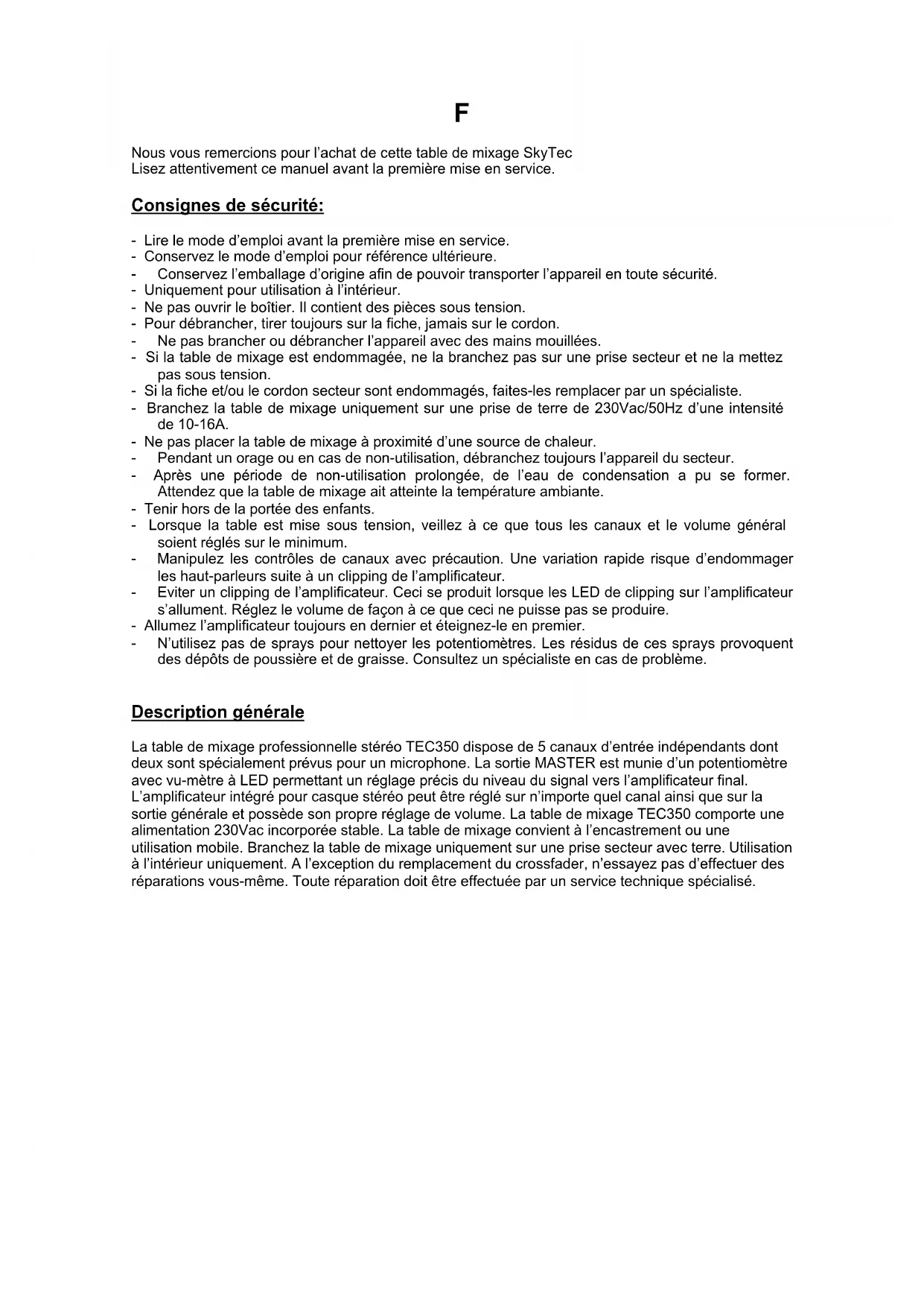 L'amplificateur intégré pour casque stéreo peut être régle sur n'importe quel canal ainsi que sur la sortie générale et possède son propre réglage de volume. La table de mixage TEC350 comporte une alimentation 230Vac incorporeee stable. La table de mixage convient à l'encastrement ou une utilisation mobile. Branchez la table de mixage uniquement sur une prise secteur avec terre. Utilisation à l'intérieur uniquement. A l'excection du remplacement du crossfader, n'essayez pas d'effectuer des réparations vous-même. Toutre réparation doit être effectué par un service technique spécialisé.
