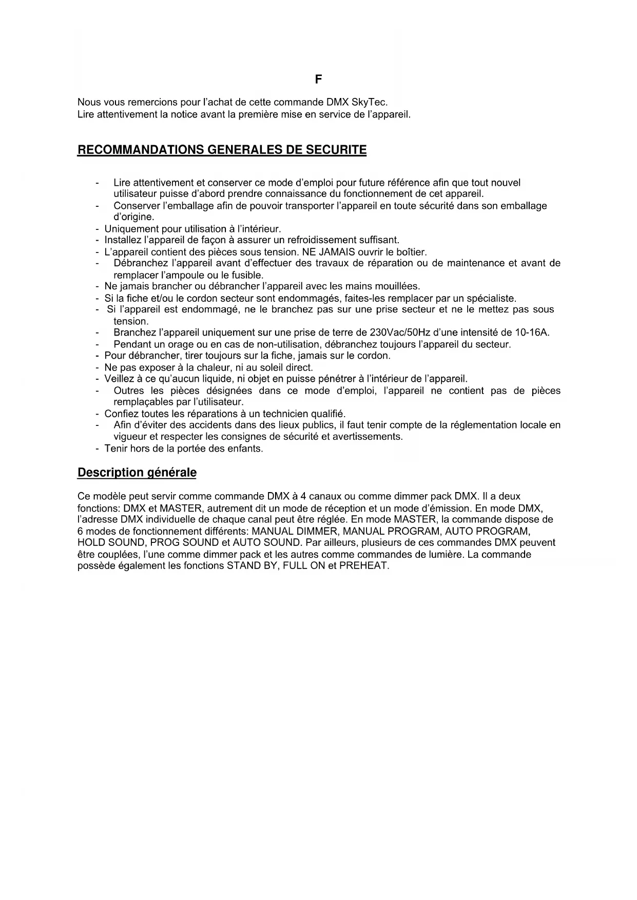 Nous you remercions pour l'achat de cette commande DMX SkyTec. Lire attentivement la notice avant la première mise en service de I'appareil.