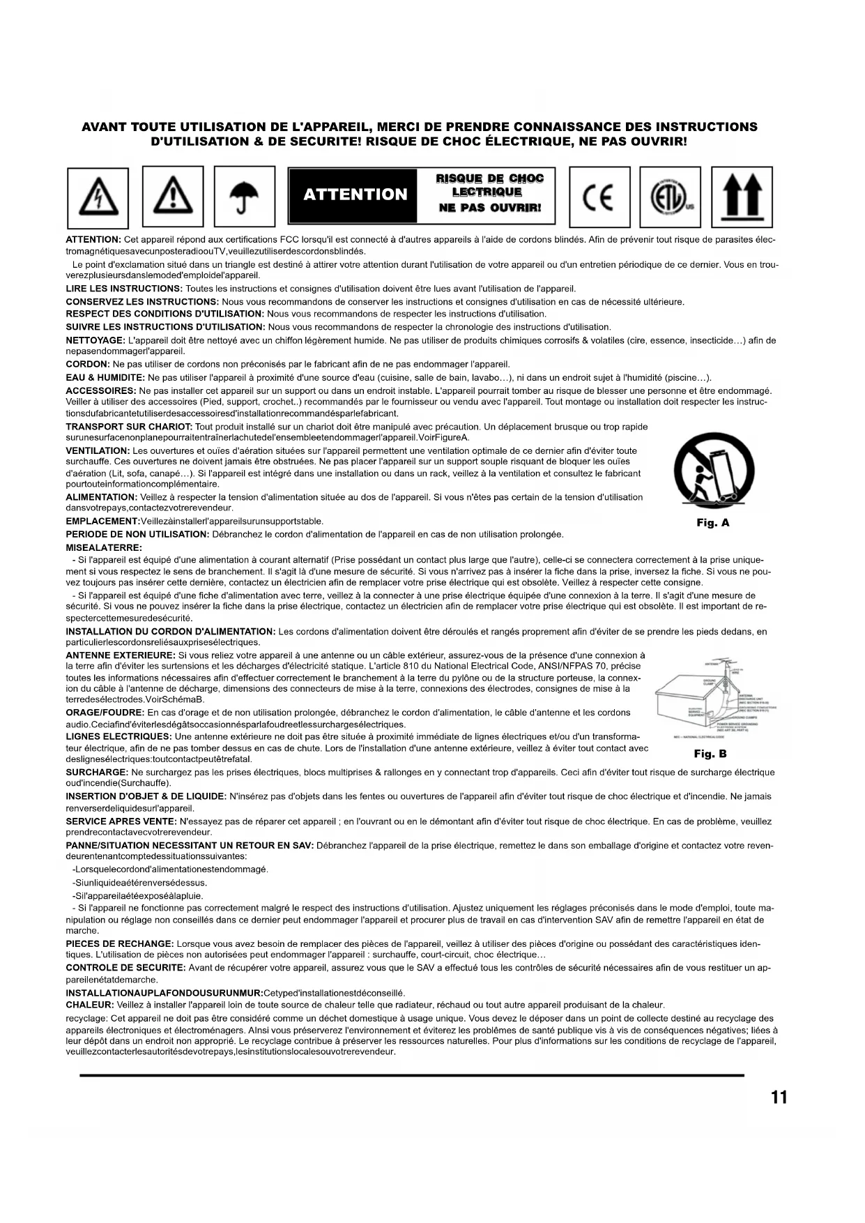 CDX-2250 ESPECIFICACIONES:ATTENTION: Cet appareil répond aux certifications FCC lorsqu'il est connecté à d'autres appareils à l'aide de cordons blindés. Afin de prévenir tout risque de parasites élec- tromagnétiques avec un poste radio ou TV, veuillez utiliser des cordons blindés. Le point d'exclamation situé dans un triangle est destiné à attirer votre attention durant l'utilisation de votre appareil ou d'un entretien périodique de ce dernier. Vous en trou- verez plusieurs dans le mode d'emploi de l'appareil. LIRE LES INSTRUCTIONS: Toutes les instructions et consignes d'utilisation doivent être lues avant l'utilisation de l'appareil. CONSERVEZ LES INSTRUCTIONS: Nous vous recommandons de conserver les instructions et consignes d'utilisation en cas de nécessité ultérieure. RESPECT DES CONDITIONS D'UTILISATION: Nous vous recommandons de respecter les instructions d'utilisation. SUIVRE LES INSTRUCTIONS D'UTILISATION: Nous vous recommandons de respecter la chronologie des instructions d'utilisation. NETTOYAGE: L'appareil doit être nettoyé avec un chiffon légèrement humide. Ne pas utiliser de produits chimiques corrosifs & volatiles (cire, essence, insecticide…) afin de ne pas endommager l'appareil. CORDON: Ne pas utiliser de cordons non préconisés par le fabricant afin de ne pas endommager l'appareil. EAU & HUMIDITE: Ne pas utiliser l'appareil à proximité d'une source d'eau (cuisine, salle de bain, lavabo…), ni dans un endroit sujet à l'humidité (piscine…). ACCESSOIRES: Ne pas installer cet appareil sur un support ou dans un endroit instable. L'appareil pourrait tomber au risque de blesser une personne et être endommagé. Veiller à utiliser des accessoires (Pied, support, crochet..) recommandés par le fournisseur ou vendu avec l'appareil. Tout montage ou installation doit respecter les instruc- tions du fabricant et utiliser des accessoires d'installation recommandés par le fabricant. TRANSPORT SUR CHARIOT: Tout produit installé sur un chariot doit être manipulé avec précaution. Un déplacement brusque ou trop rapide sur une surface non plane pourrait entraîner la chute de l'ensemble et endommager l'appareil. Voir Figure A. VENTILATION: Les ouvertures et ouïes d'aération situées sur l'appareil permettent une ventilation optimale de ce dernier afin d'éviter toute surchauffe. Ces ouvertures ne doivent jamais être obstruées. Ne pas placer l'appareil sur un support souple risquant de bloquer les ouïes d'aération (Lit, sofa, canapé…). Si l'appareil est intégré dans une installation ou dans un rack, veillez à la ventilation et consultez le fabricant pour toute information complémentaire. ALIMENTATION: Veillez à respecter la tension d'alimentation située au dos de l'appareil. Si vous n'êtes pas certain de la tension d'utilisation dans votre pays, contactez votre revendeur.EMPLACEMENT: Veillez à installer l'appareil sur un support stable. PERIODE DE NON UTILISATION: Débranchez le cordon d'alimentation de l'appareil en cas de non utilisation prolongée. MISE A LA TERRE: - Si l'appareil est équipé d'une alimentation à courant alternatif (Prise possédant un contact plus large que l'autre), celle-ci se connectera correctement à la prise unique- ment si vous respectez le sens de branchement. Il s'agit là d'une mesure de sécurité. Si vous n'arrivez pas à insérer la fiche dans la prise, inversez la fiche. Si vous ne pou- vez toujours pas insérer cette dernière, contactez un électricien afin de remplacer votre prise électrique qui est obsolète. Veillez à respecter cette consigne. - Si l'appareil est équipé d'une fiche d'alimentation avec terre, veillez à la connecter à une prise électrique équipée d'une connexion à la terre. Il s'agit d'une mesure de sécurité. Si vous ne pouvez insérer la fiche dans la prise électrique, contactez un électricien afin de remplacer votre prise électrique qui est obsolète. Il est important de re- specter cette mesure de sécurité. INSTALLATION DU CORDON D'ALIMENTATION: Les cordons d'alimentation doivent être déroulés et rangés proprement afin d'éviter de se prendre les pieds dedans, en particulier les cordons reliés aux prises électriques. ANTENNE EXTERIEURE: Si vous reliez votre appareil à une antenne ou un câble extérieur, assurez-vous de la présence d'une connexion à la terre afin d'éviter les surtensions et les décharges d'électricité statique. L'article 810 du National Electrical Code, ANSI/NFPAS 70, précise toutes les informations nécessaires afin d'effectuer correctement le branchement à la terre du pylône ou de la structure porteuse, la connex- ion du câble à l'antenne de décharge, dimensions des connecteurs de mise à la terre, connexions des électrodes, consignes de mise à la terre des électrodes. Voir Schéma B. ORAGE/FOUDRE: En cas d'orage et de non utilisation prolongée, débranchez le cordon d'alimentation, le câble d'antenne et les cordons audio. Ceci afin d'éviter les dégâts occasionnés par la foudre et les surcharges électriques. LIGNES ELECTRIQUES: Une antenne extérieure ne doit pas être située à proximité immédiate de lignes électriques et/ou d'un transforma- teur électrique, afin de ne pas tomber dessus en cas de chute. Lors de l'installation d'une antenne extérieure, veillez à éviter tout contact avec des lignes électriques : tout contact peut être fatal. SURCHARGE: Ne surchargez pas les prises électriques, blocs multiprises & rallonges en y connectant trop d'appareils. Ceci afin d'éviter tout risque de surcharge électrique ou d'incendie (Surchauffe). INSERTION D'OBJET & DE LIQUIDE: N'insérez pas d'objets dans les fentes ou ouvertures de l'appareil afin d'éviter tout risque de choc électrique et d'incendie. Ne jamais renverser de liquide sur l'appareil. SERVICE APRES VENTE: N'essayez pas de réparer cet appareil ; en l'ouvrant ou en le démontant afin d'éviter tout risque de choc électrique. En cas de problème,
