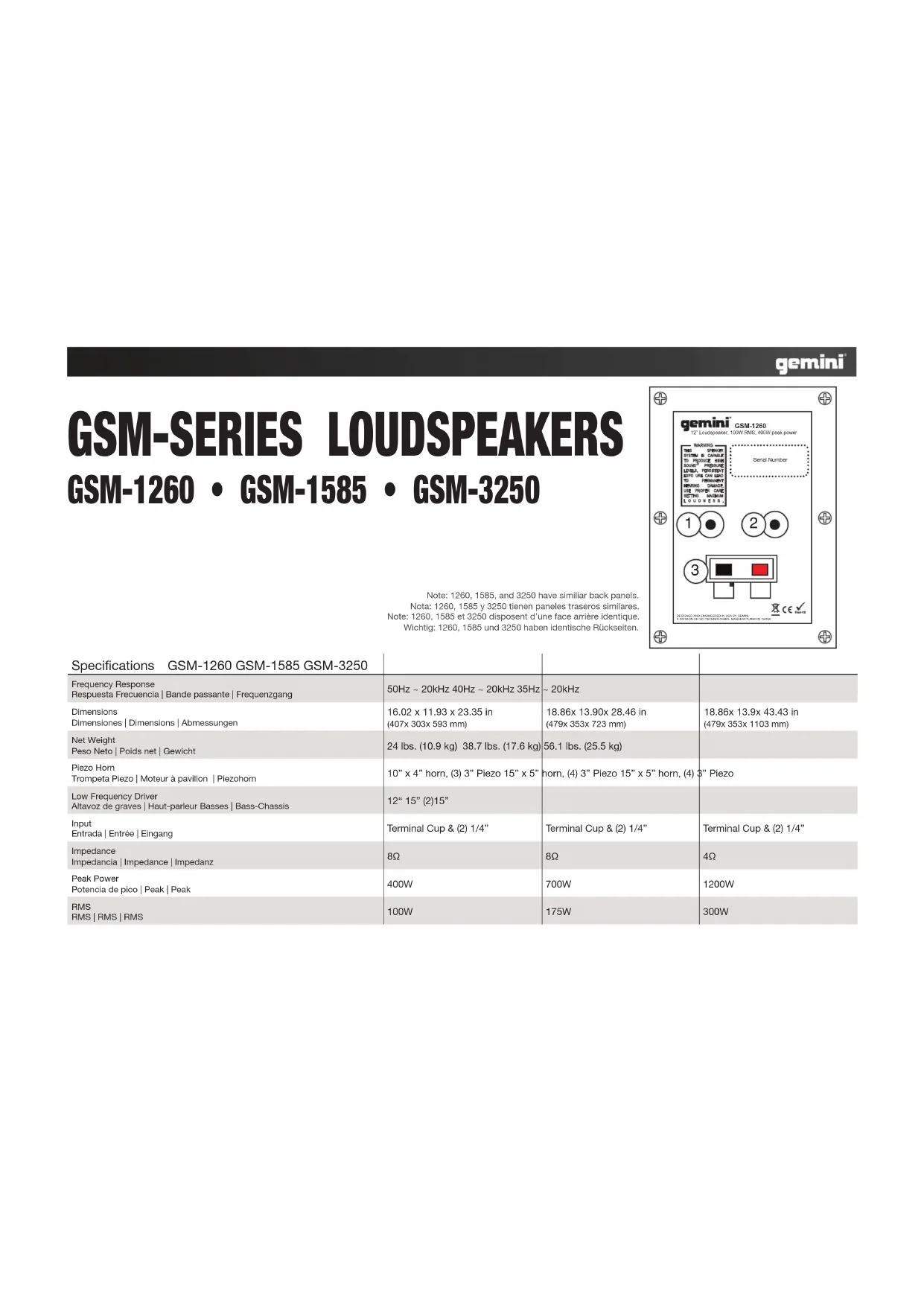 ajustez les commandes de volume à partir de votre mélangeur sur un niveau raisonnable. CHAÎNE-LIEN: Seulement 1 haut-parleur additionnel peut être ajouté à chaque hautparleur dans une installation de MAILLON de CHAÎNE. Reliez vos hautparleurs suivent d’abord alors les étapes pour une instal- lation NORMALE, votre AMPLIFICATEUR devrait compenser les haut-parleurs supplémentaires. EINFÜHRUNG: Glückwünsche auf Ihrem Erwerb eines GSM-REIHE Lautsprechers, ausgeführt u. durch Gemini Sound Produkte hergestellt. Dieser Zustand des kunstlautsprechers wurde durch eine einjährige Garantie unterstützt. VORSICHTSMAßNAHMEN: