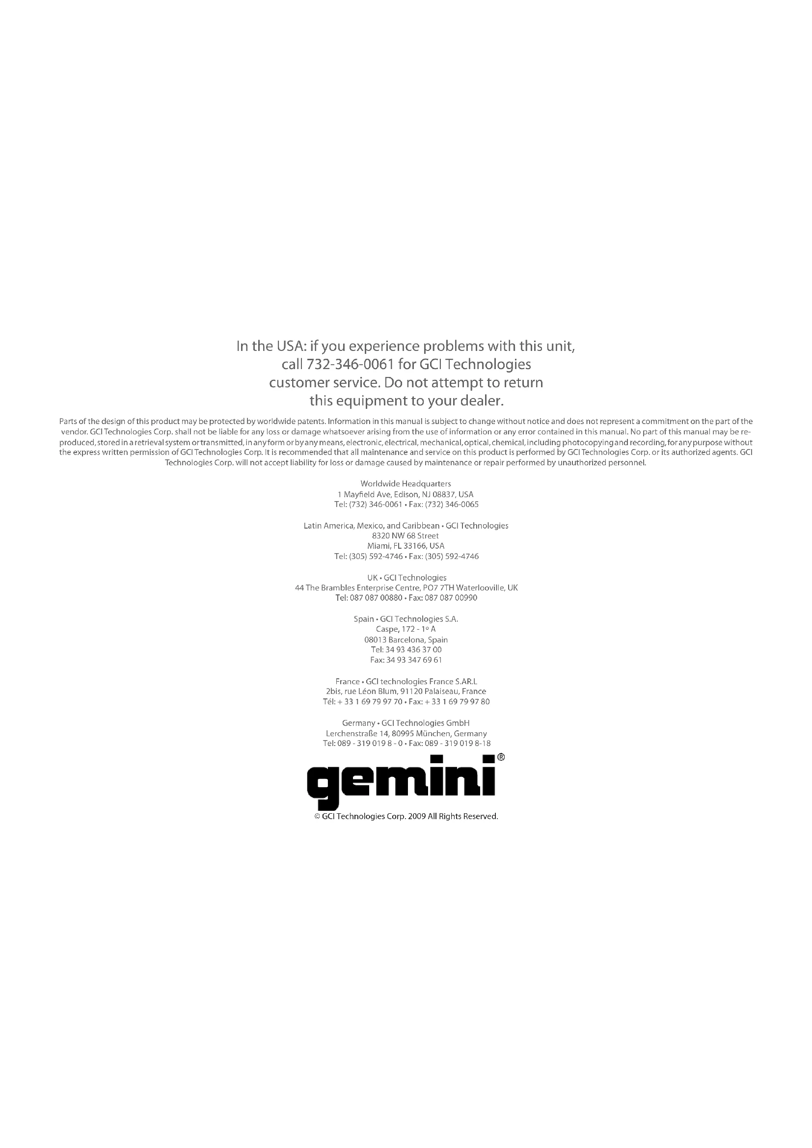 - NE PAS OUVRIR: - Ne pas démonter l’appareli an d’accéder aux compos- ants internes en vue d’une éventuelle réparation/modica- tion. Cet appareil ne contient pas de pièces/composants qui puissent être réparés par l’utilisateur. En cas de panne/ dysfonctionnement, veuillez contacter votre revendeur ou le service technique de GEMINI au 01 69 79 97 79 (FRANCE).