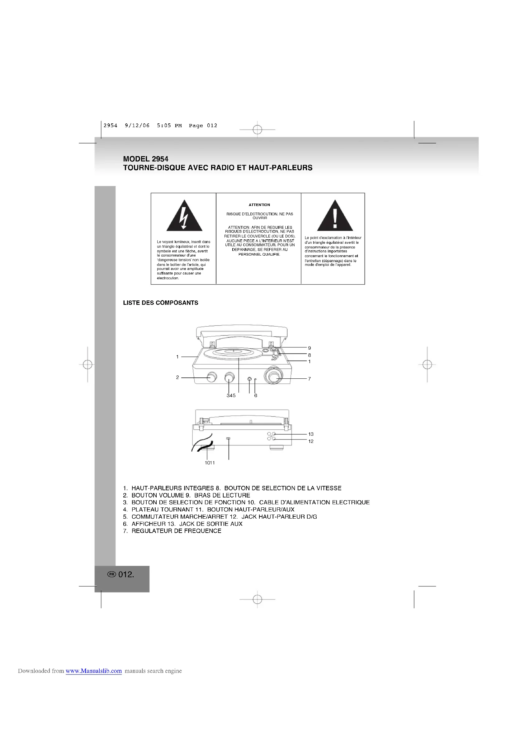 2954 9/12/06 5:05 PM Page 011 Downloaded from www.Manualslib.com manuals search engineLISTE DES COMPOSANTS1. HAUT-PARLEURS INTEGRES 8. BOUTON DE SELECTION DE LA VITESSE2. BOUTON VOLUME 9. BRAS DE LECTURE3. BOUTON DE SELECTION DE FONCTION 10. CABLE D’ALIMENTATION ELECTRIQUE4. PLATEAU TOURNANT 11. BOUTON HAUT-PARLEUR/AUX5. COMMUTATEUR MARCHE/ARRET 12. JACK HAUT-PARLEUR D/G6. AFFICHEUR 13. JACK DE SORTIE AUX7. REGULATEUR DE FREQUENCE Le voyant lumineux, inscrit dansun triangle équilatéral et dont lesymbole est une flèche, avertitle consommateur d’une‘dangereuse tension’ non isoléedans le boîtier de l’article, quipourrait avoir une amplitudesuffisante pour causer uneélectrocution.ATTENTIONRISQUE D’ELECTROCUTION. NE PASOUVRIRATTENTION: AFIN DE REDUIRE LESRISQUES D’ELECTROCUTION, NE PASRETIRER LE COUVERCLE (OU LE DOS).AUCUNE PIECE A L’INTERIEUR N’ESTUTILE AU CONSOMMATEUR. POUR UNDEPANNAGE, SE REFERER AUPERSONNEL QUALIFIE.Le point d’exclamation à l’intérieurd’un triangle équilatéral avertit leconsommateur de la présenced’instructions importantesconcernant le fonctionnement etl’entretien (dépannage) dans lemode d’emploi de l’appareil. MODEL 2954