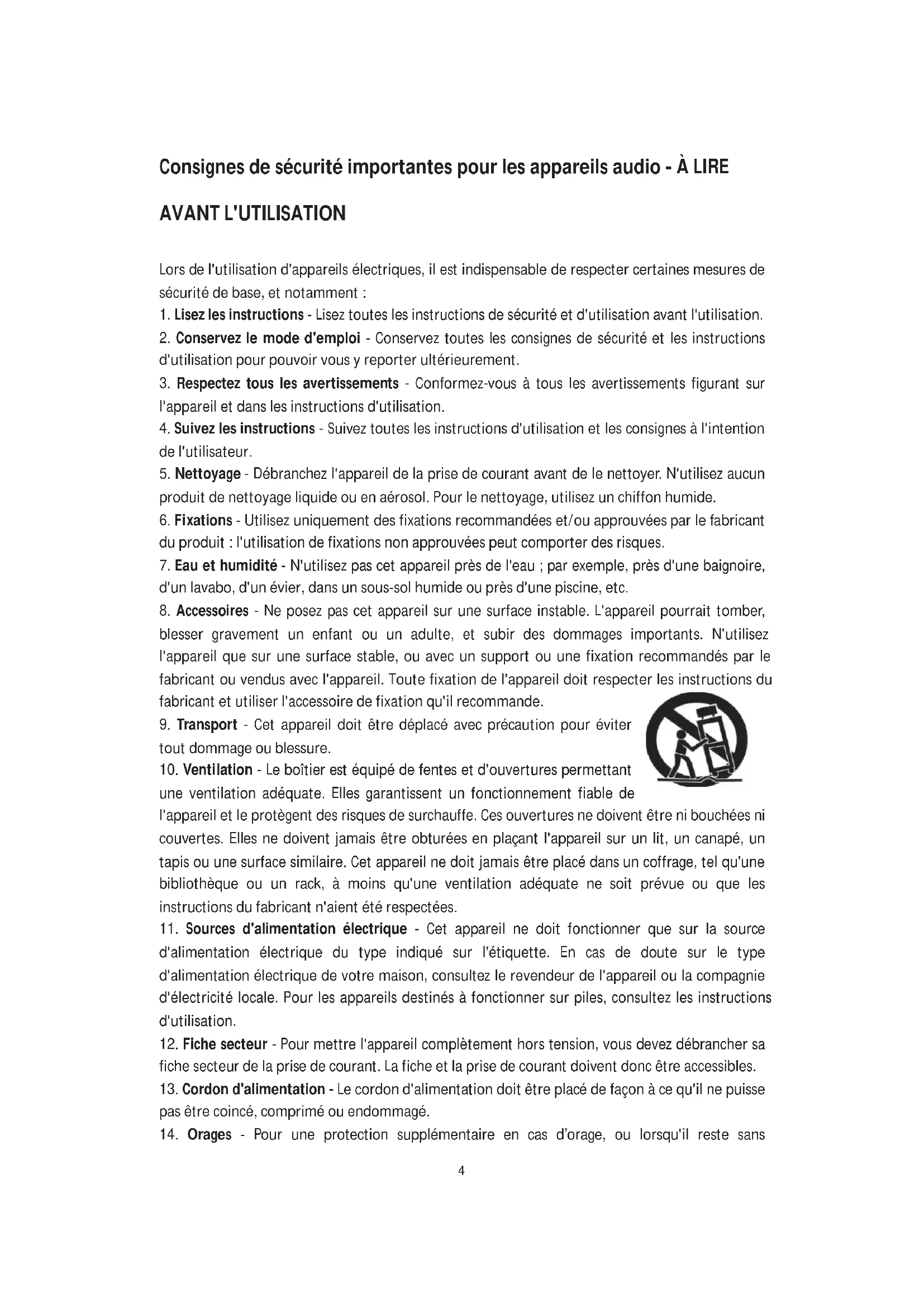 - Transport - Cet apparéil doit être déplace avec précaution pour éviter tout dommage ou blessure.