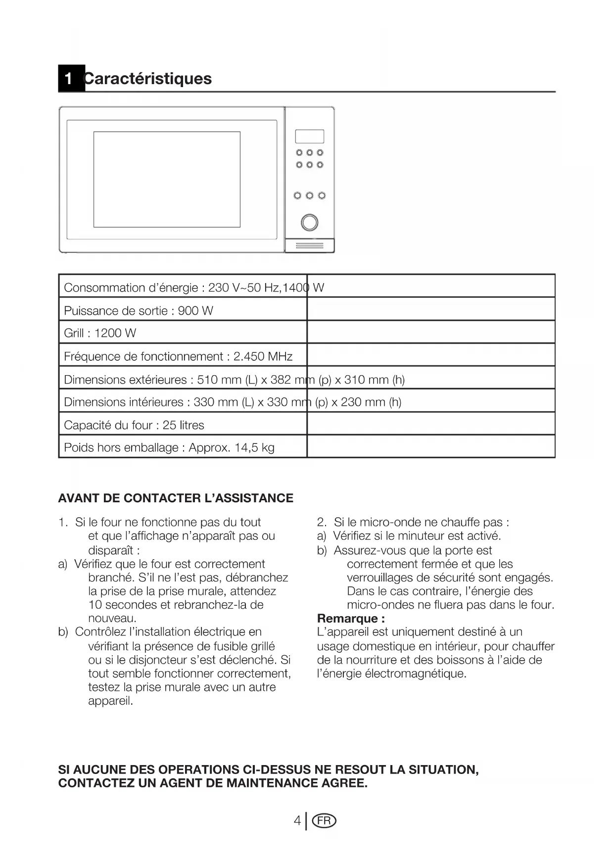 Consommation d’énergie : 230 V~50 Hz,1400 W Puissance de sortie : 900 W Grill : 1200 W Fréquence de fonctionnement : 2.450 MHz Dimensions extérieures : 510 mm (L) x 382 mm (p) x 310 mm (h) Dimensions intérieures : 330 mm (L) x 330 mm (p) x 230 mm (h) Capacité du four : 25 litres Poids hors emballage : Approx. 14,5 kg 1 Caractéristiques