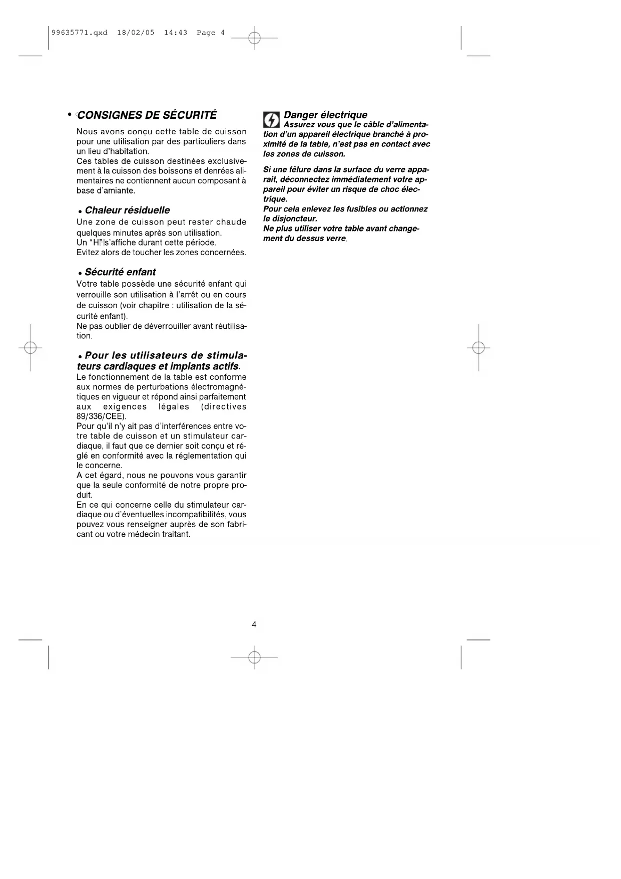Le fonctionnement de la table est conformeaux normes de perturbations électromagné-tiques en vigueur et répond ainsi parfaitementaux exigences légales (directives89/336/CEE).Pour qu’il n’y ait pas d’interférences entre vo-tre table de cuisson et un stimulateur car-diaque, il faut que ce dernier soit conçu et ré-glé en conformité avec la réglementation quile concerne.A cet égard, nous ne pouvons vous garantirque la seule conformité de notre propre pro-duit.En ce qui concerne celle du stimulateur car-diaque ou d’éventuelles incompatibilités, vouspouvez vous renseigner auprès de son fabri-cant ou votre médecin traitant. Danger électrique Assurez vous que le câble d’alimenta- tion d’un appareil électrique branché à pro- ximité de la table, n’est pas en contact avec les zones de cuisson. Si une fêlure dans la surface du verre appa- rait, déconnectez immédiatement votre ap- pareil pour éviter un risque de choc élec- trique. Pour cela enlevez les fusibles ou actionnez le disjoncteur. Ne plus utiliser votre table avant change- ment du dessus verre