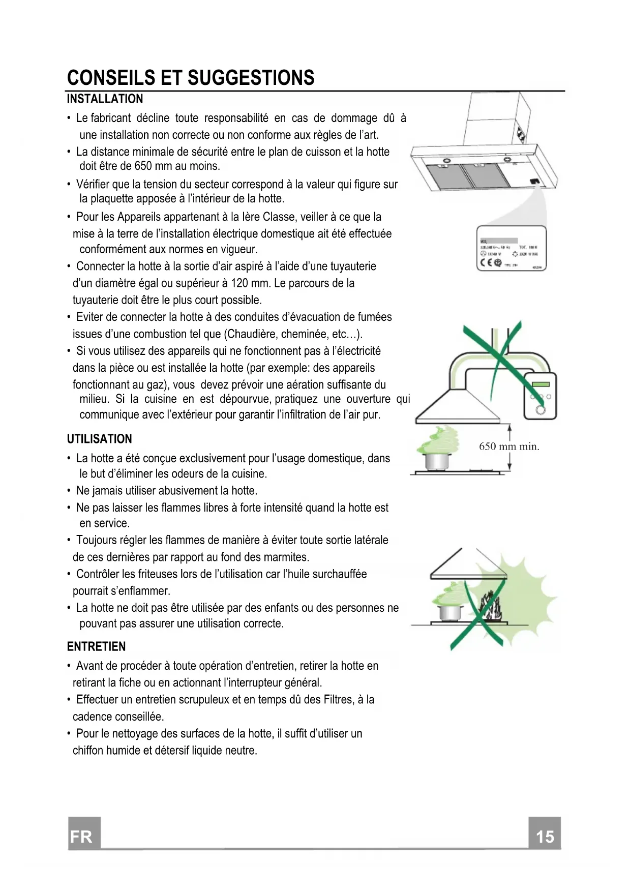- La distance minimale de sécurité entre le plan de cuisson et la hotte doit être de 650 mm au moins.
