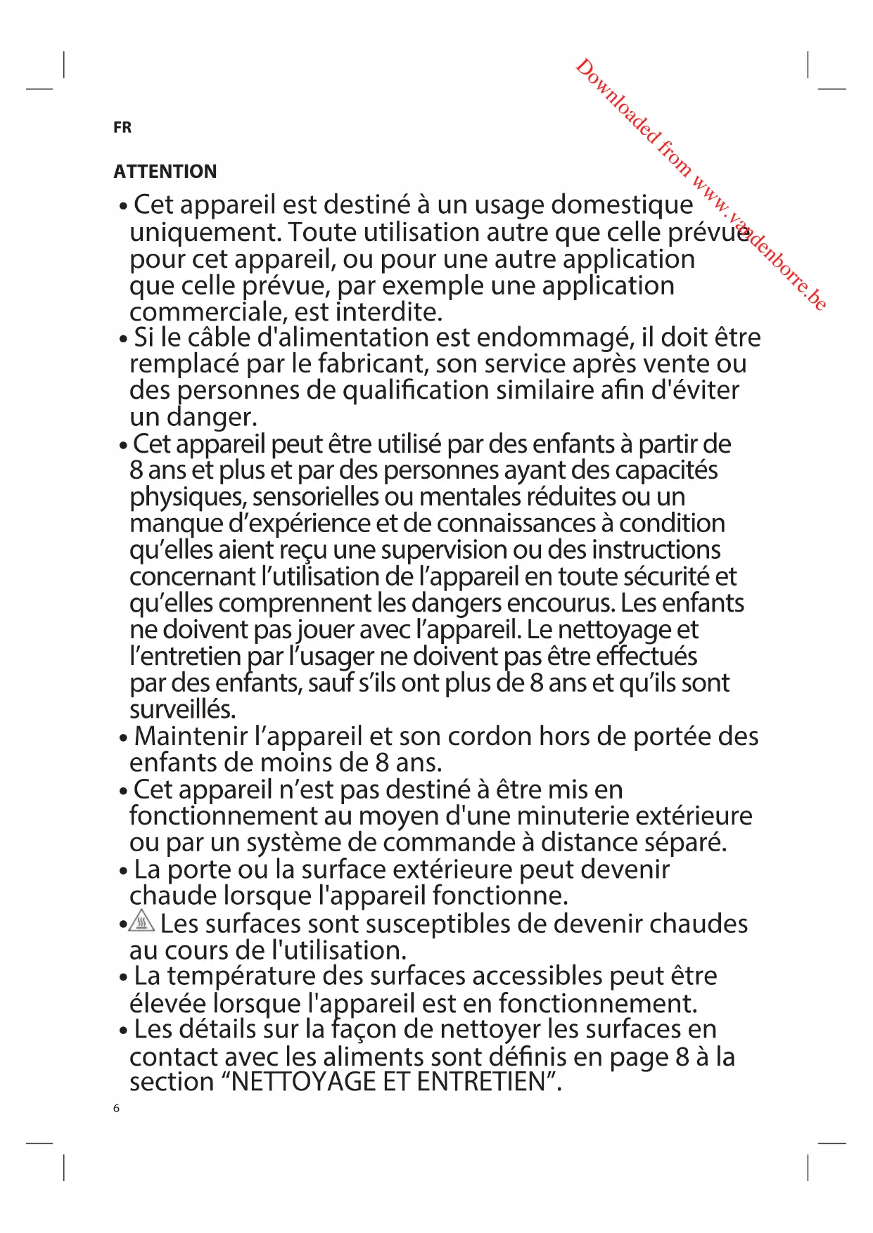 Nos emballages / produits peuvent faire l’objet d’une consigne de tri, pour en savoir plus: www.quefairedemesdechets.fr Downloaded from www.vandenborre.be8 Aucun autre appareil ne doit être branché sur la même prise que le four. Il est conseillé de faire fonctionner le four à la température maximale (230°C) en fonction convection ( ) pendant environ 10 minutes an d'éliminer tous les éventuels résidus d'emballage ou de graisse utilisés pour l'emballage et le transport. Le four peut émettre une légère odeur accompagnée de fumée pendant ce premier fonctionnement d'essai. Ce phénomène est normal. UTILISATION Veillez à bien installer le ramasse-miettes en bas du four avant de l'utiliser. Convection / Convection avec air pulsé Ces réglages conviennent parfaitement pour rôtir les pommes de terre, la viande, les légumes, les plats préparés, les casseroles, les ragoûts, le pain, les gâteaux et les desserts.