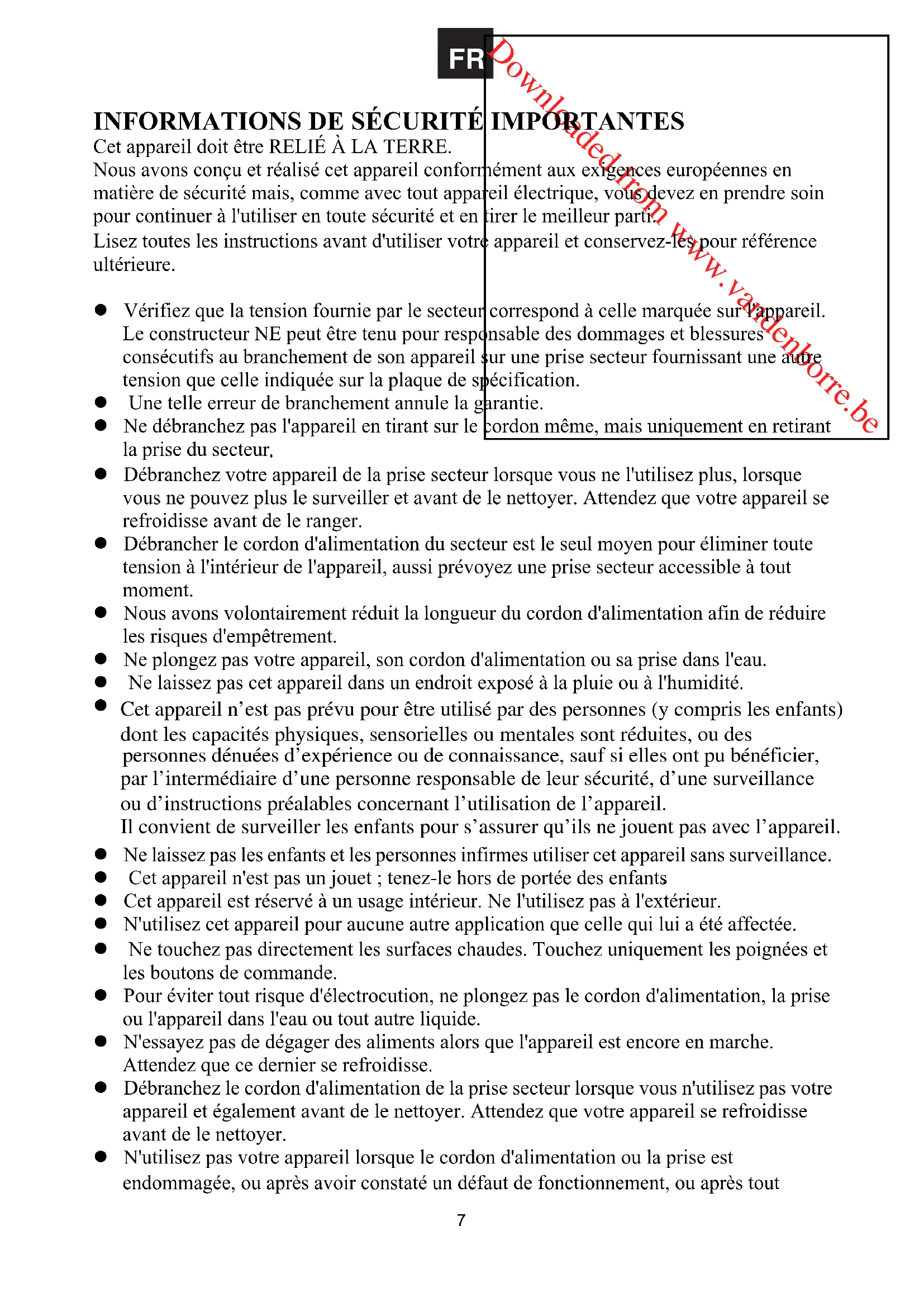 Cet appareil n’est pas prévu pour être utilisé par des personnes (y compris les enfants) dont les capacités physiques, sensorielles ou mentales sont réduites, ou des personnes dénuées d’expérience ou de connaissance, sauf si elles ont pu bénéficier, par l’intermédiaire d’une personne responsable de leur sécurité, d’une surveillance ou d’instructions préalables concernant l’utilisation de l’appareil. Il convient de surveiller les enfants pour s’assurer qu’ils ne jouent pas avec l’appareil.Downloaded from www.vandenborre.be dommage intervenu sur l'appareil. Dans un tel cas, apportez l'appareil au magasin où vous l'avez acheté pour conseil. z N'utilisez pas d'objet métallique pour atteindre les aliments, par exemple un couteau, une fourchette ou une cuillère, car il peut devenir chaud ou se charger d'électricité au contact avec l'appareil. z N'insérez pas de trop gros morceaux de nourriture dans l'appareil, vous risquez de provoquer un début d'incendie. z Ne laissez pas le cordon d'alimentation pendre au-dessus de l'appareil ou entrer en contact avec l'une de ses surfaces chaudes. z Ne placez pas l'appareil au-dessus ou à proximité d'un réchaud à gaz ou électrique chaud, ou dans un four chaud. z N'utilisez pas l'appareil à proximité d'un récipient contenant un liquide, par exemple un évier. z Pour éteindre l'appareil, débranchez le cordon d'alimentation de la prise secteur. z L'utilisation d'accessoires non agréés par le constructeur vous expose à des risques d'incendie, d'électrocution et de blessures corporelles. z N'enveloppez pas les aliments dans du papier d'aluminium avant de les placer dans le four. z Enlevez tous les emballages de protection avant d'utiliser votre four. z Cet appareil N'A PAS été conçu pour être connecté à une minuterie externe ou être commandé par une télécommande. ATTENTION : Surfaces chaudes. La température des surfaces accessibles devient très chaude lorsque l'appareil fonctionne. AVERTISSEMENTS : z Cet appareil est destiné à un usage domestique uniquement. Une utilisation commerciale ou autre invalide la garantie et vous expose à un danger. z Pour remplacer le cordon d'alimentation, adressez-vous au constructeur, à son centre de service ou à une personne qualifiée pour éviter tout risque d'électrocution. z N'utilisez pas votre appareil à proximité d'une baignoire, d'un évier ou de toute autre source d'eau. Si votre appareil tombe dans l'eau, n'essayez pas de le récupérer. Débranchez immédiatement son cordon d'alimentation de la prise secteur, évacuez l'eau et uniquement ensuite récupérez votre appareil. Ne l'utilisez pas avant de l'avoir fait vérifier par un technicien qualifié. z Les surfaces accessibles s'échauffent en cours de fonctionnement. Touchez uniquement les poignées et les boutons.