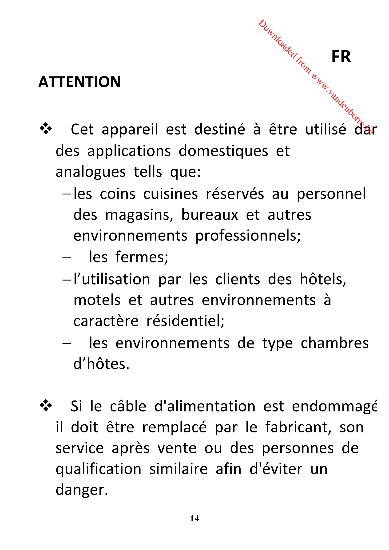 l’utilisation par les clients des hôtels, motels et autres environnements à caractère résidentiel; les environnements de type chambres d’hôtes. Si le câble d'alimentation est endommagé, il doit être remplacé par le fabricant, son service après vente ou des personnes de qualification similaire afin d'éviter un danger. Downloaded from www.vandenborre.beFR