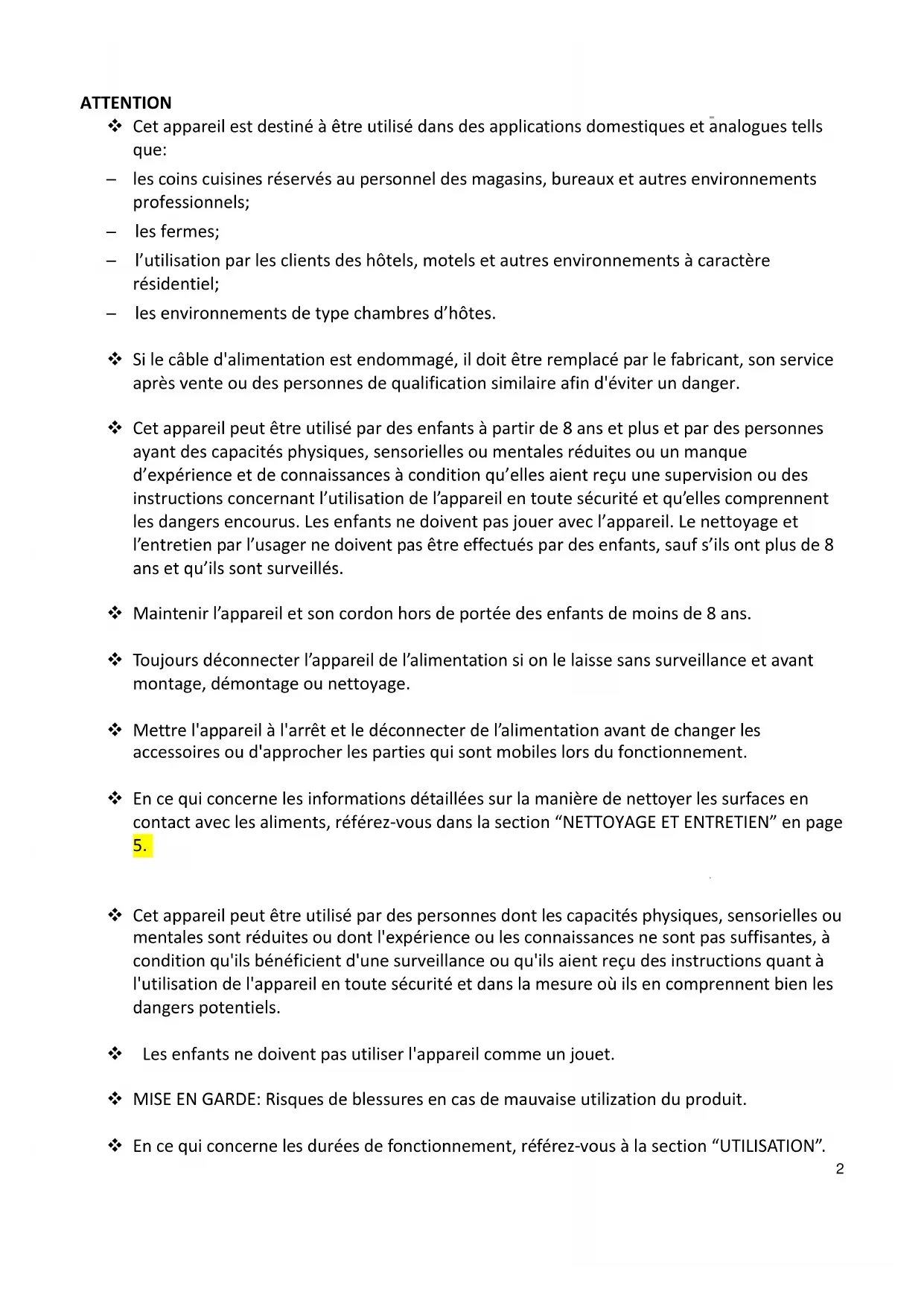 MODE D'EMPLOI2 ATTENTION Cet appareil est destiné à être utilisé dans des applications domestiques et analogues tells que: – les coins cuisines réservés au personnel des magasins, bureaux et autres environnements professionnels; – les fermes; – l’utilisation par les clients des hôtels, motels et autres environnements à caractère résidentiel; – les environnements de type chambres d’hôtes. Si le câble d'alimentation est endommagé, il doit être remplacé par le fabricant, son service après vente ou des personnes de qualification similaire afin d'éviter un danger. Cet appareil peut être utilisé par des enfants à partir de 8 ans et plus et par des personnes ayant des capacités physiques, sensorielles ou mentales réduites ou un manque d’expérience et de connaissances à condition qu’elles aient reçu une supervision ou des instructions concernant l’utilisation de l’appareil en toute sécurité et qu’elles comprennent les dangers encourus. Les enfants ne doivent pas jouer avec l’appareil. Le nettoyage et l’entretien par l’usager ne doivent pas être effectués par des enfants, sauf s’ils ont plus de 8 ans et qu’ils sont surveillés. Maintenir l’appareil et son cordon hors de portée des enfants de moins de 8 ans. Toujours déconnecter l’appareil de l’alimentation si on le laisse sans surveillance et avant montage, démontage ou nettoyage. Mettre l'appareil à l'arrêt et le déconnecter de l’alimentation avant de changer les accessoires ou d'approcher les parties qui sont mobiles lors du fonctionnement. En ce qui concerne les informations détaillées sur la manière de nettoyer les surfaces en contact avec les aliments, référez-vous dans la section “NETTOYAGE ET ENTRETIEN” en page