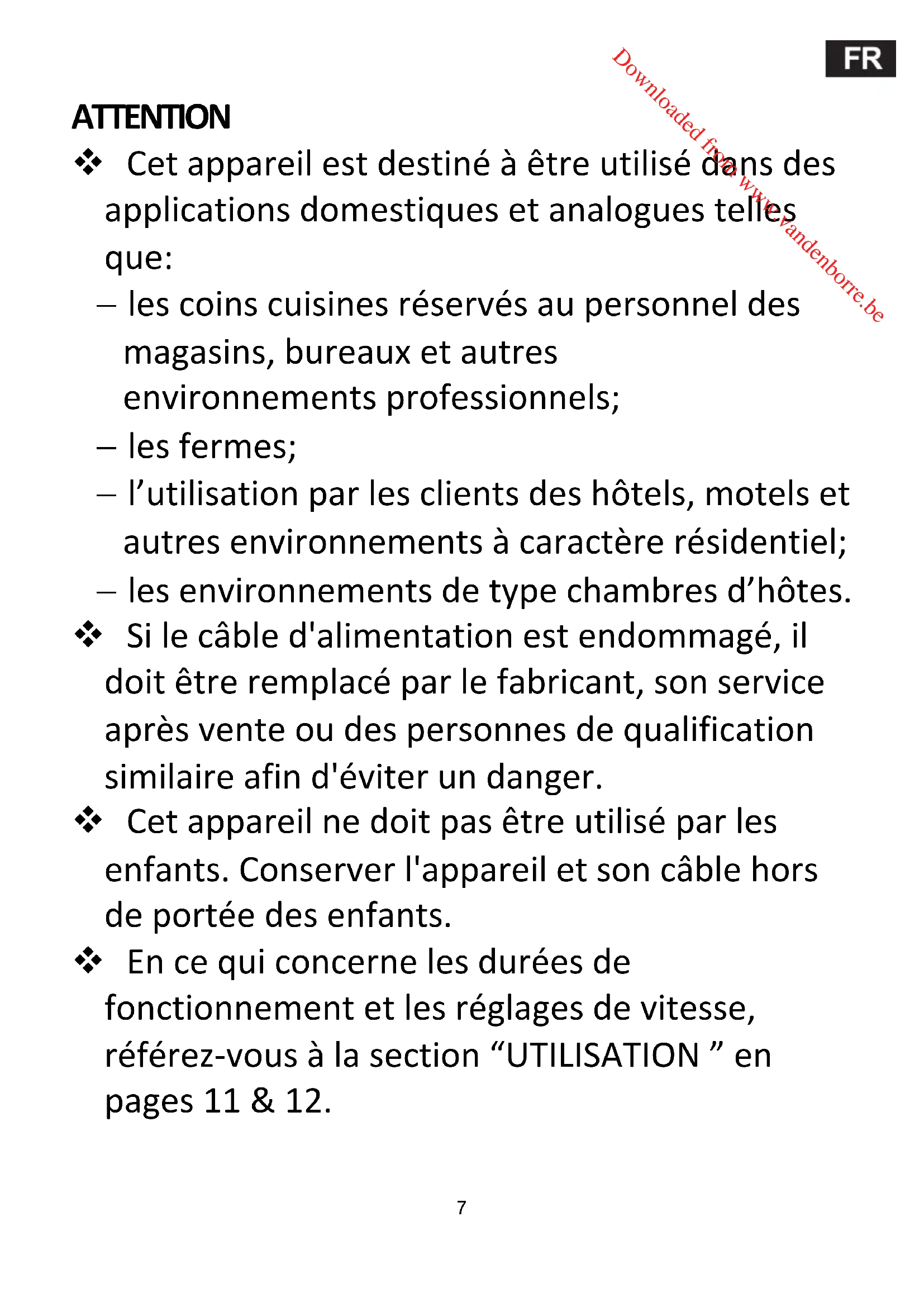 Downloaded from www.vandenborre.beATTENTION Cet appareil est destiné à être utilisé dans des applications domestiques et analogues telles que: les coins cuisines réservés au personnel des magasins, bureaux et autres environnements professionnels; les fermes; l’utilisation par les clients des hôtels, motels et autres environnements à caractère résidentiel; les environnements de type chambres d’hôtes. Si le câble d'alimentation est endommagé, il doit être remplacé par le fabricant, son service après vente ou des personnes de qualification similaire afin d'éviter un danger. Cet appareil ne doit pas être utilisé par les enfants. Conserver l'appareil et son câble hors de portée des enfants. En ce qui concerne les durées de fonctionnement et les réglages de vitesse, référez-vous à la section “UTILISATION ” en pages 11 & 12.