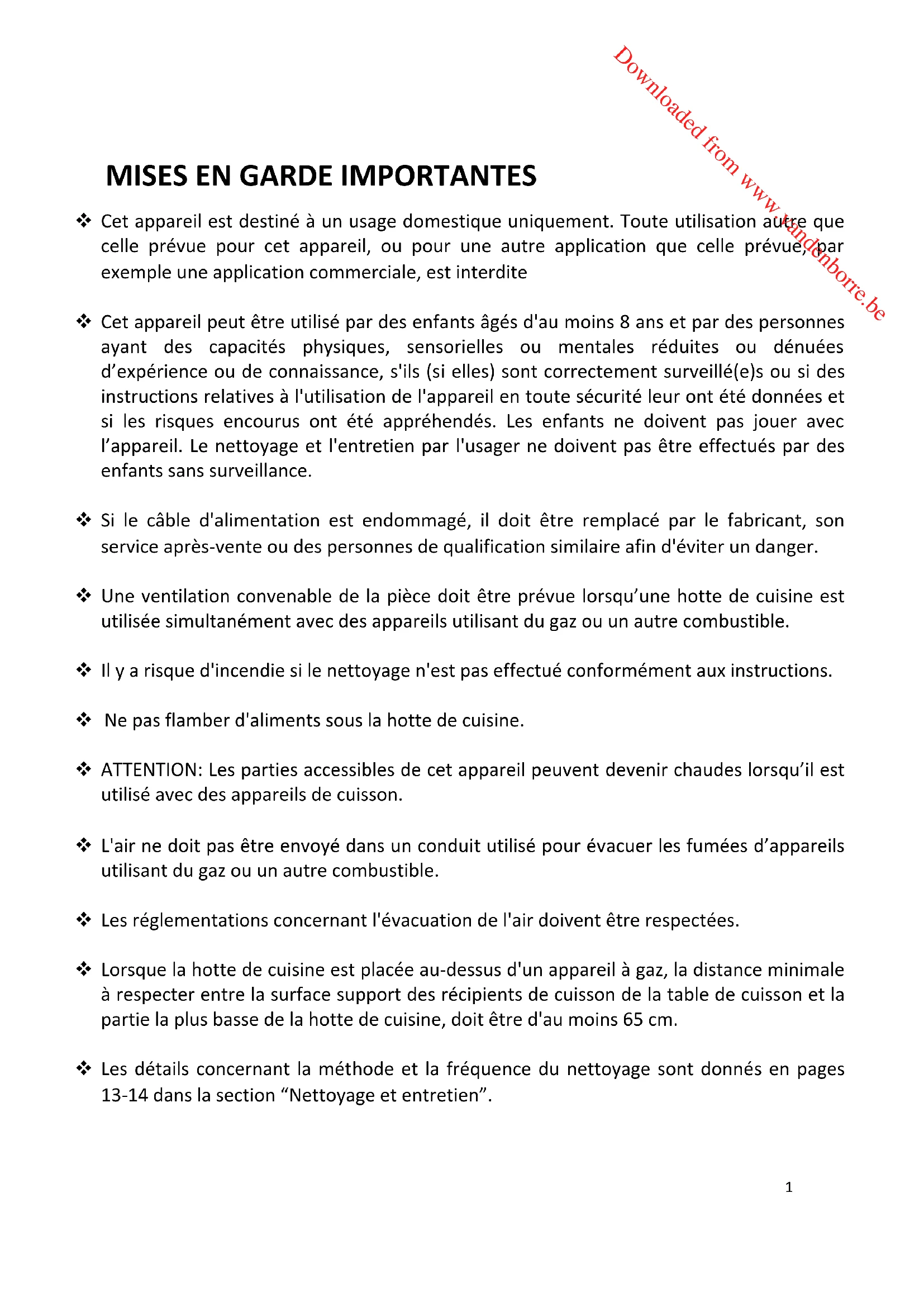Cet appareil est destiné à un usage domestique uniquement. Toute utilisation autre que celle prévue pour cet appareil, ou pour une autre application que celle prévue, par exemple une application commerciale, est interdite Cet appareil peut être utilisé par des enfants âgés d'au moins 8 ans et par des personnes ayant des capacités physiques, sensorielles ou mentales réduites ou dénuées d’expérience ou de connaissance, s'ils (si elles) sont correctement surveillé(e)s ou si des instructions relatives à l'utilisation de l'appareil en toute sécurité leur ont été données et si les risques encourus ont été appréhendés. Les enfants ne doivent pas jouer avec l’appareil. Le nettoyage et l'entretien par l'usager ne doivent pas être effectués par des enfants sans surveillance. Si le câble d'alimentation est endommagé, il doit être remplacé par le fabricant, son service après-vente ou des personnes de qualification similaire afin d'éviter un danger. Une ventilation convenable de la pièce doit être prévue lorsqu’une hotte de cuisine est utilisée simultanément avec des appareils utilisant du gaz ou un autre combustible. Il y a risque d'incendie si le nettoyage n'est pas effectué conformément aux instructions. Ne pas flamber d'aliments sous la hotte de cuisine. ATTENTION: Les parties accessibles de cet appareil peuvent devenir chaudes lorsqu’il est utilisé avec des appareils de cuisson. L'air ne doit pas être envoyé dans un conduit utilisé pour évacuer les fumées d’appareils utilisant du gaz ou un autre combustible. Les réglementations concernant l'évacuation de l'air doivent être respectées. Lorsque la hotte de cuisine est placée au-dessus d'un appareil à gaz, la distance minimale à respecter entre la surface support des récipients de cuisson de la table de cuisson et la partie la plus basse de la hotte de cuisine, doit être d'au moins 65 cm. Les détails concernant la méthode et la fréquence du nettoyage sont donnés en pages 13-14 dans la section “Nettoyage et entretien”. Downloaded from www.vandenborre.be2