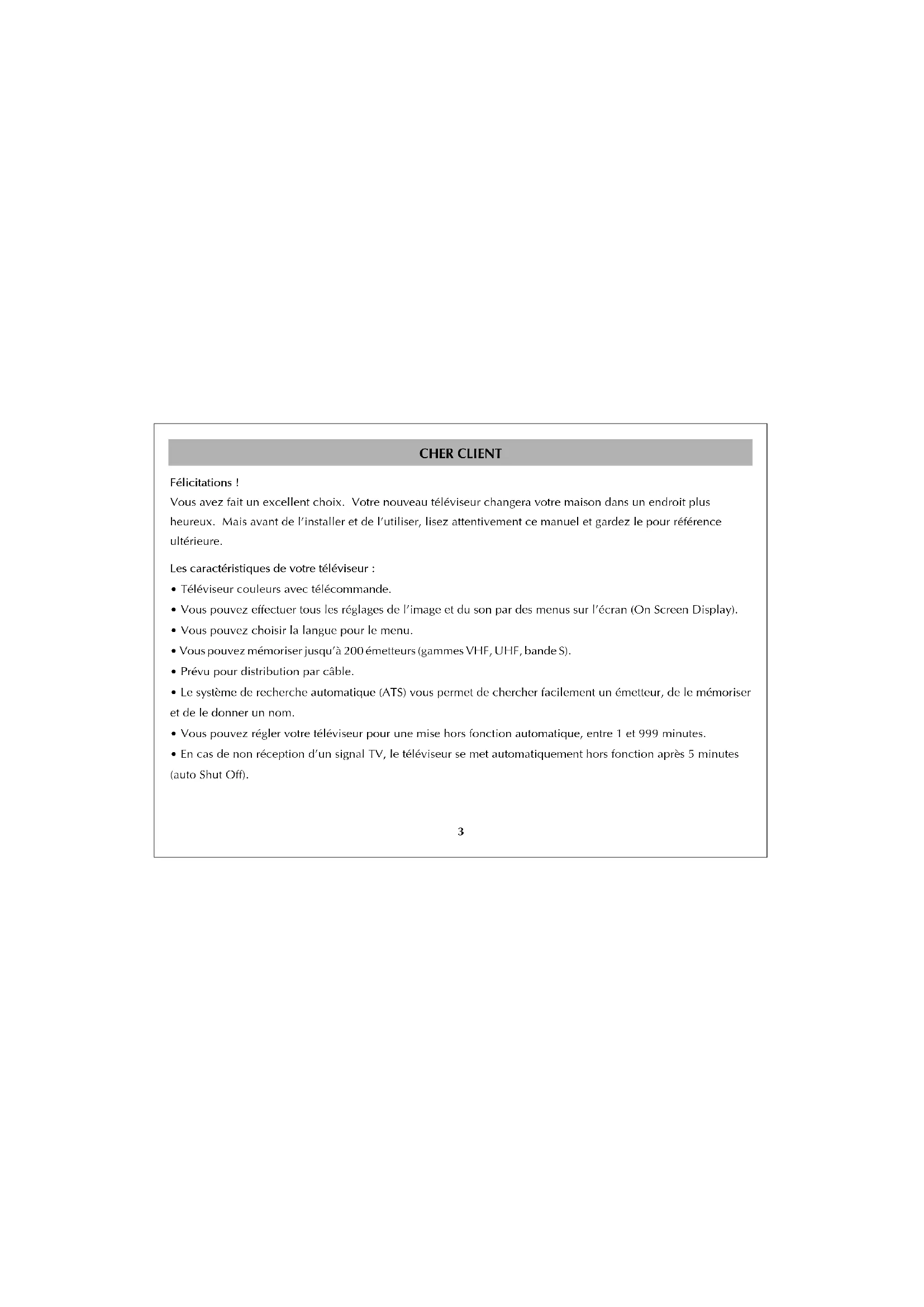 - En cas de non réception d’un signal TV, le téléviseur se met automatiquement hors fonction après 5 minutes (auto Shut Off). 065001047560 PT 200 TM36 FRAN 21/9/05 16:17 Page 3ATTENTION POUR LA SECURITE DE VOTRE TELEVISEUR