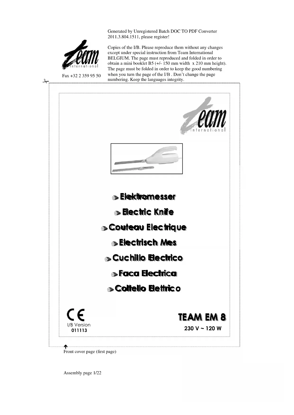 Veillez à ne pas utiliser l'appareil à l'extérieur et entreposez-le dans un endroit sec. Ne pas utiliser des accessoires non recommandés par le fabricant, cela peut présenter un danger pour l’utilisateur et risque d’endommager l’appareil. Ne déplacez jamais et ne suspendez pas votre appareil à l’aide de son cordon d’alimentation. Veillez à ce que le cordon d’alimentation ne puisse être accidentellement accroché et ce, afin d’éviter toute chute de l’appareil. Évitez d’enrouler le cordon autour de l’appareil et ne le tordez pas. Veillez à ne pas exposer le cordon au tranchant des lames même si l’appareil est à l’arrêt afin de ne pas l’endommager. Toujours débranchez l’appareil lorsqu’il n’est pas en utilisation même si c’est pour un court instant. N’utilisez ce couteau que dans le cadre d’applications culinaires. Cet appareil est conçu seulement pour couper de la viande crue ou cuite désossée ou éventuellement du pain. Si vous souhaitez découper des aliments surgelés, faites usage exclusivement des lames spéciales livrées avec ce modèle. Cet appareil n’étant pas du type professionnel, ne peut fonctionner de façon continue. Il est par conséquent nécessaire d’effectuer des pauses à intervalles réguliers. Consultez la rubrique « Intervalles d’utilisation » du mode d’emploi. La lame de cet appareil est coupante, veillez à être prudent lors de la manutention de celle-ci, particulièrement lors de son nettoyage. Il est indispensable de garder cet appareil propre étant donné qu’il est en contact direct avec la nourriture. De plus, les lames étant auto-affûtantes doivent obligatoirement être nettoyées après chaque usage. Il est indispensable de débrancher l’appareil avant de monter ou de démonter les lames et donc aussi avant de les nettoyer. Ne touchez jamais la lame lorsque l’appareil est sous tension ou en fonctionnement, en outre, n’essayez pas d’immobiliser de quelque façon que ce soit son mouvement.Generated by Unregistered Batch DOC TO PDF Converter 2011.3.804.1511, please register! Copies of the I/B. Please reproduce them without any changes except under special instruction from Team International BELGIUM. The page must reproduced and folded in order to obtain a mini booklet B5 (+/- 150 mm width x 210 mm height). The page must be folded in order to keep the good numbering when you turn the page of the I/B . Don’t change the page numbering. Keep the languages integrity.